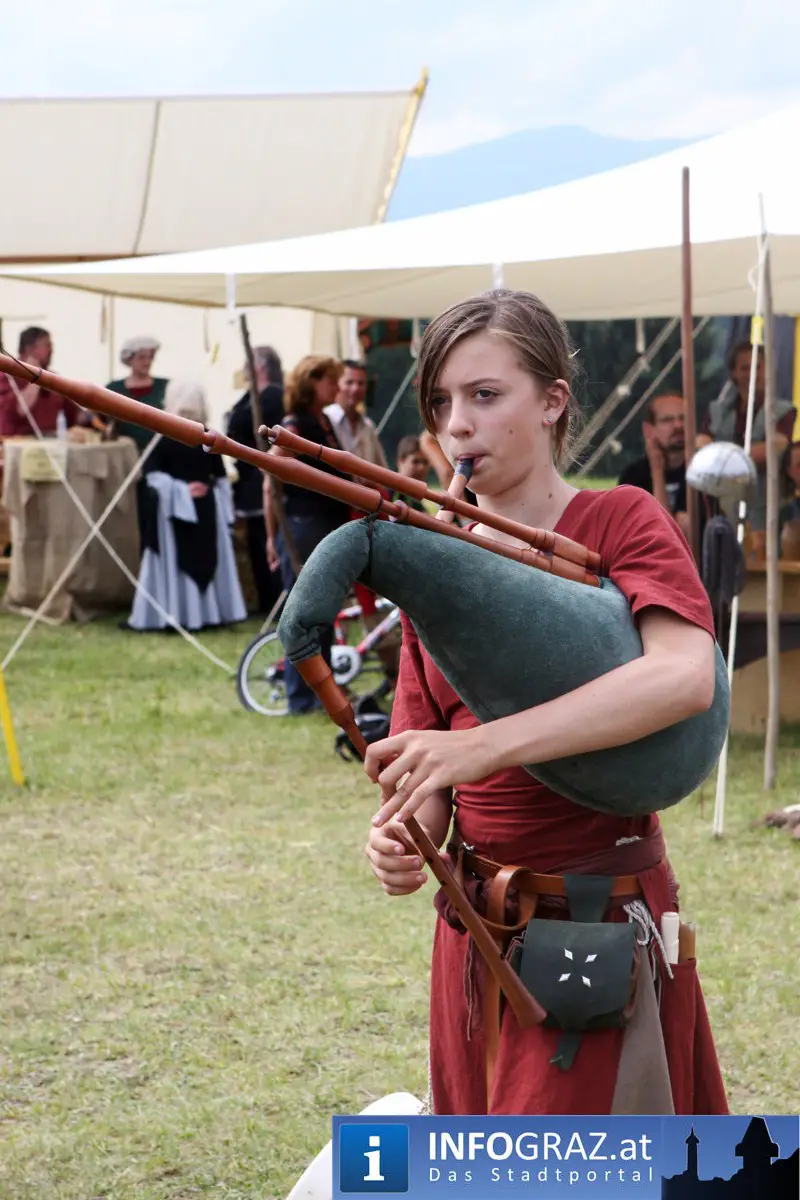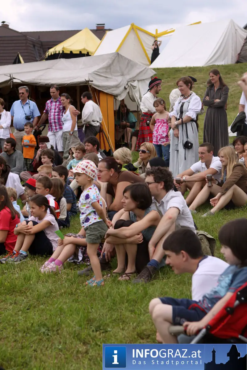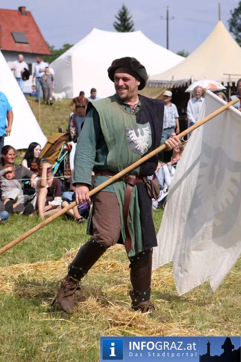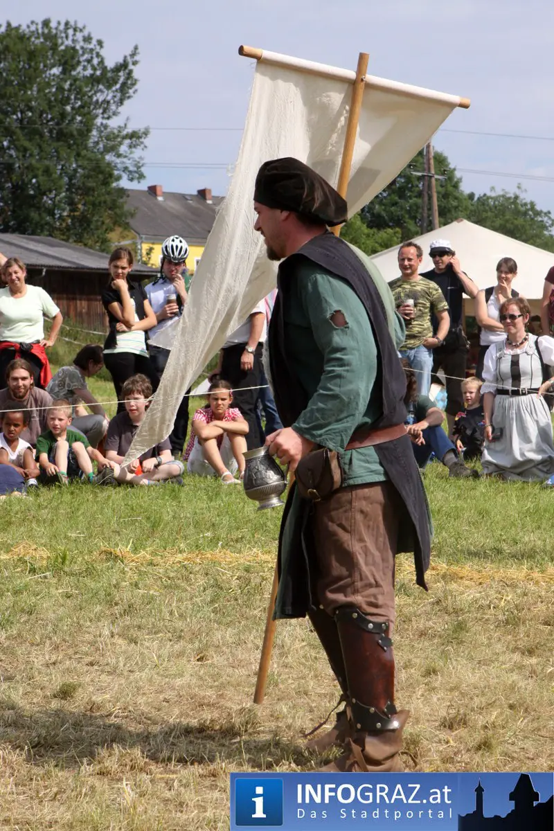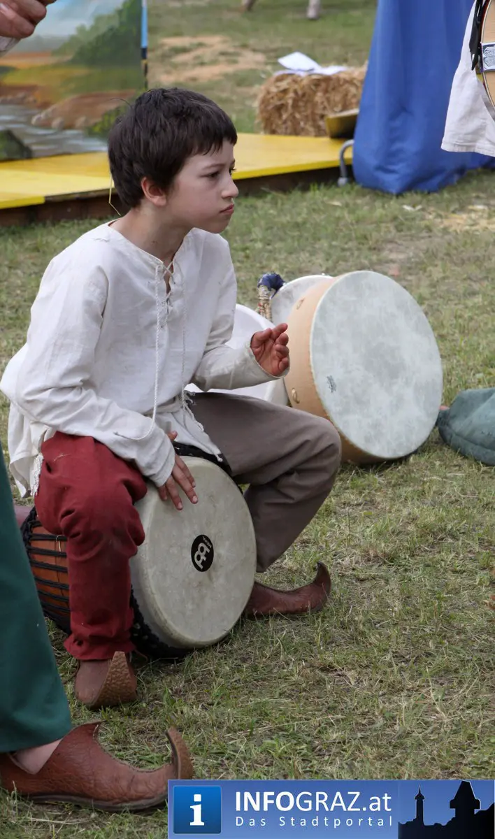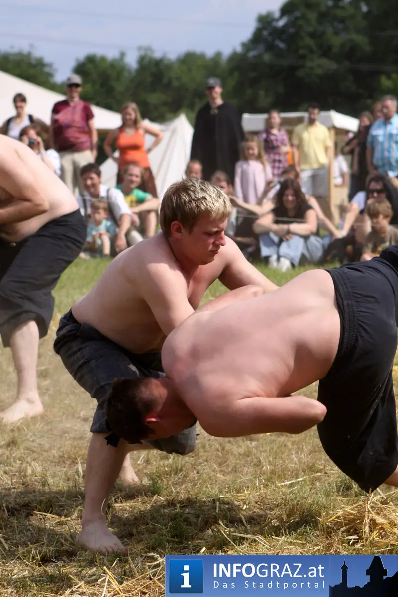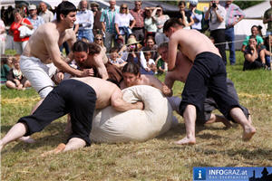 Während sich die Kinder vorbehaltlos mit dem Marionettentheater auf die Reise in eine ferne Zeit begaben, wurden die Erwachsenen mit dem herben Reiz mittelalterlicher Musik umgarnt… Eines sei schon vor Betrachten der Bilder auf INFOGRAZ.at vorweggenommen: unsere Männer von heute haben jedenfalls die vergangenen Jahrhunderte hindurch nichts an Muskelkraft und Kampfgeist eingebüßt, sei es beim Axt- und Speerwerfen, Bogen- oder Armbrustschießen oder gar beim Bruchenball-Turnier, wo mit vollem Körpereinsatz bis zum Umfallen gekämpft wurde!