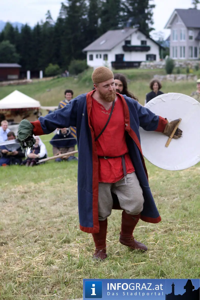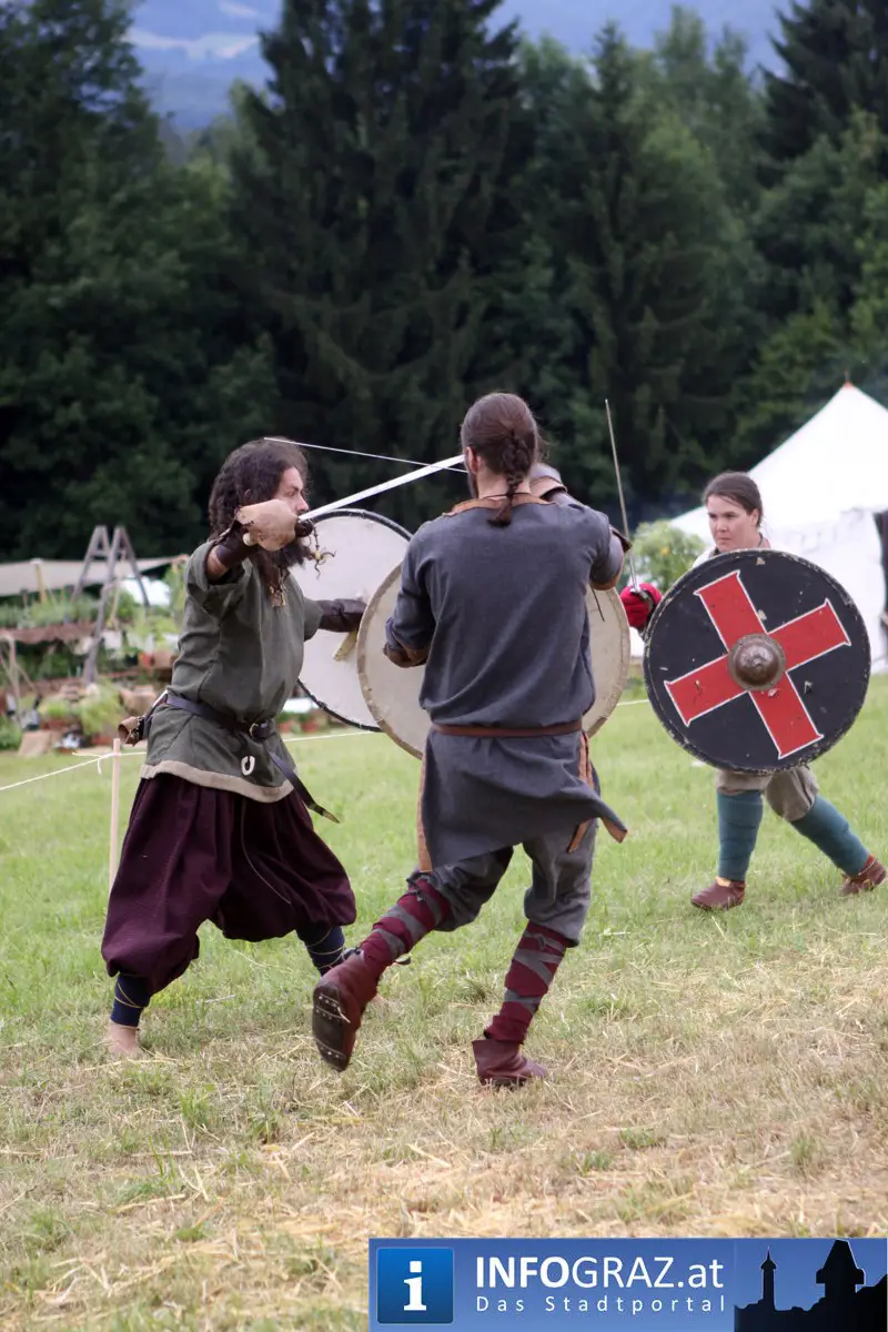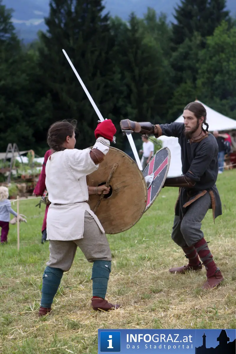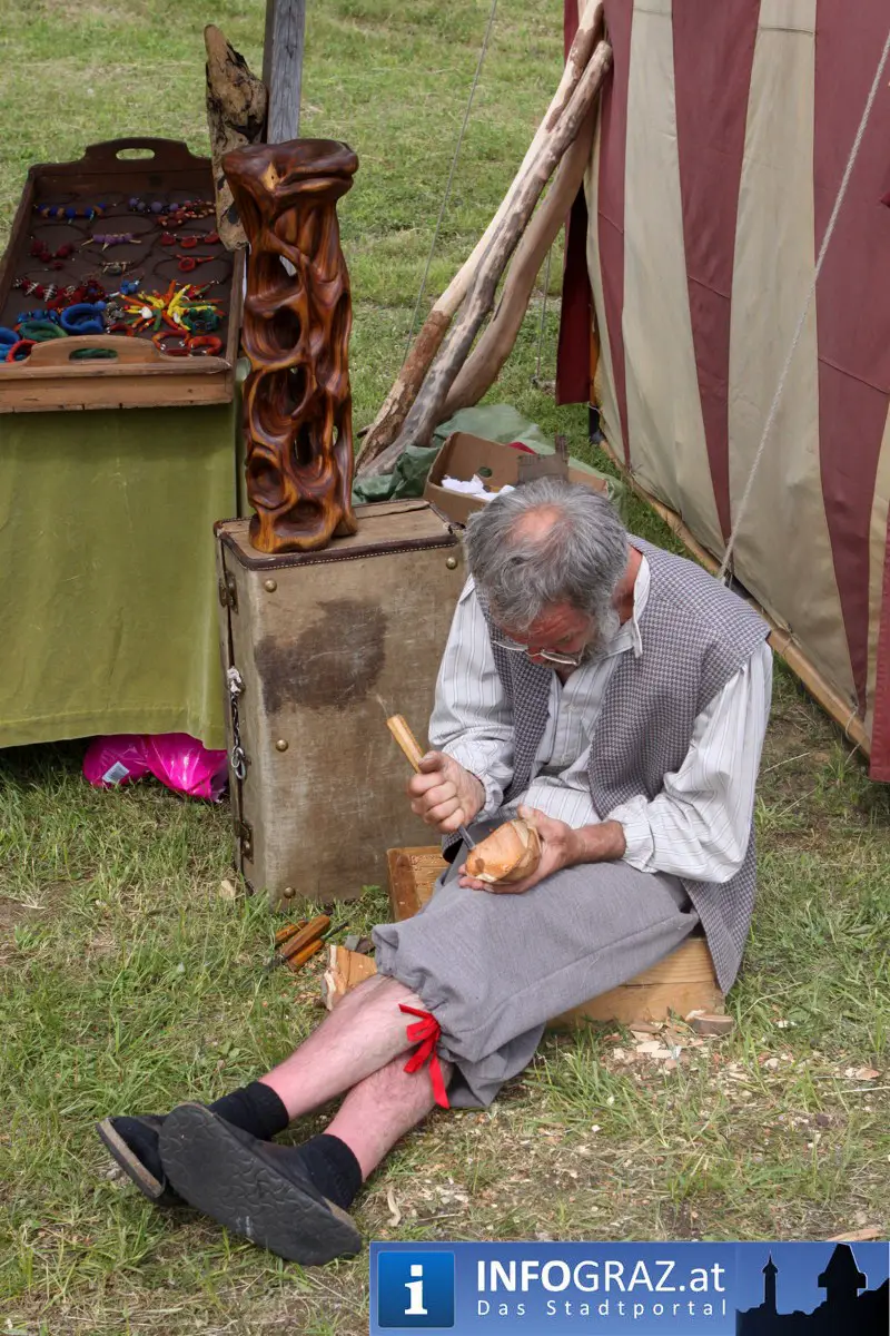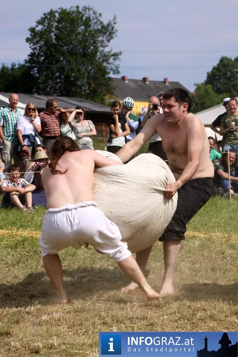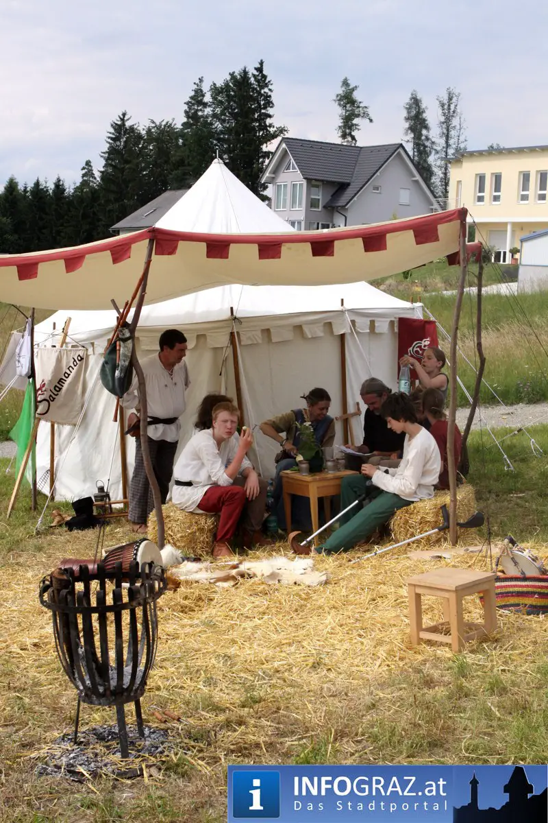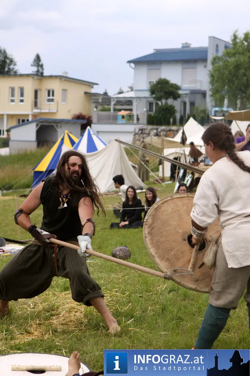 Während sich die Kinder vorbehaltlos mit dem Marionettentheater auf die Reise in eine ferne Zeit begaben, wurden die Erwachsenen mit dem herben Reiz mittelalterlicher Musik umgarnt… Eines sei schon vor Betrachten der Bilder auf INFOGRAZ.at vorweggenommen: unsere Männer von heute haben jedenfalls die vergangenen Jahrhunderte hindurch nichts an Muskelkraft und Kampfgeist eingebüßt, sei es beim Axt- und Speerwerfen, Bogen- oder Armbrustschießen oder gar beim Bruchenball-Turnier, wo mit vollem Körpereinsatz bis zum Umfallen gekämpft wurde!