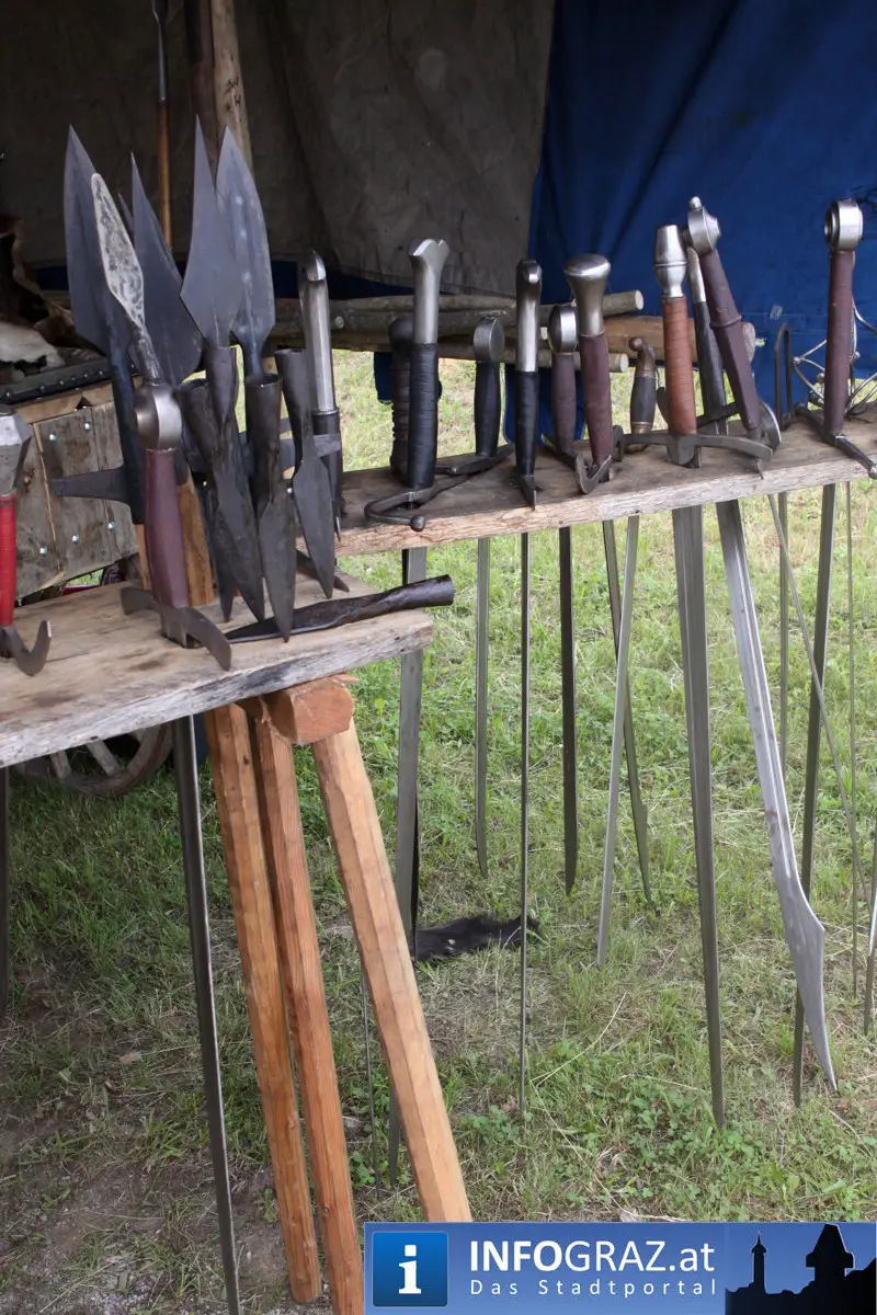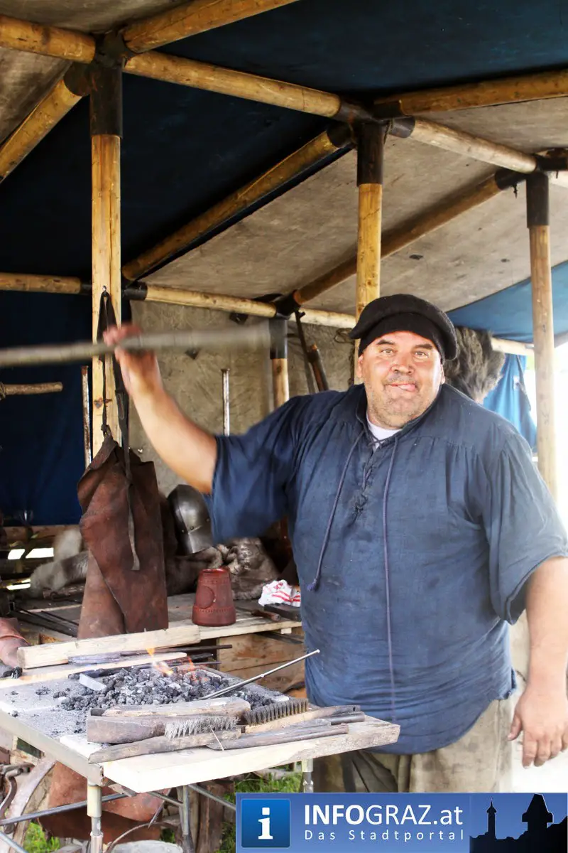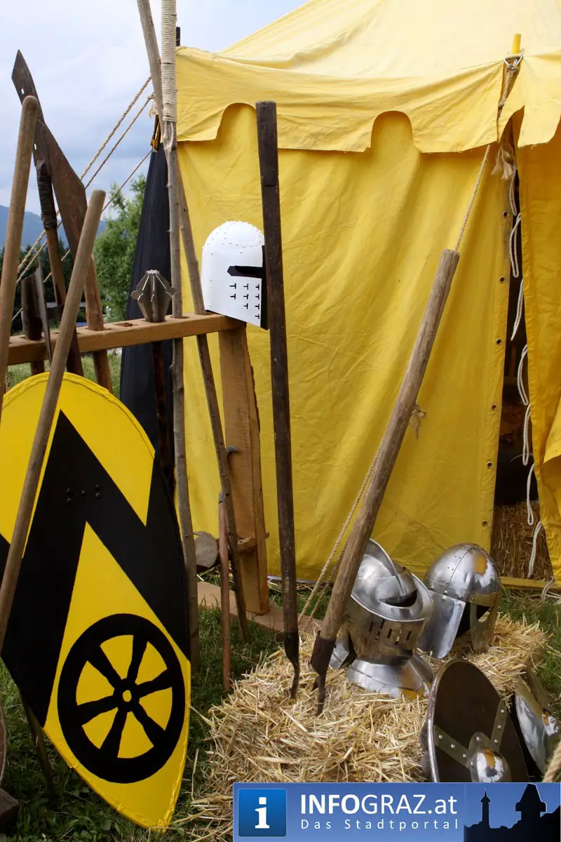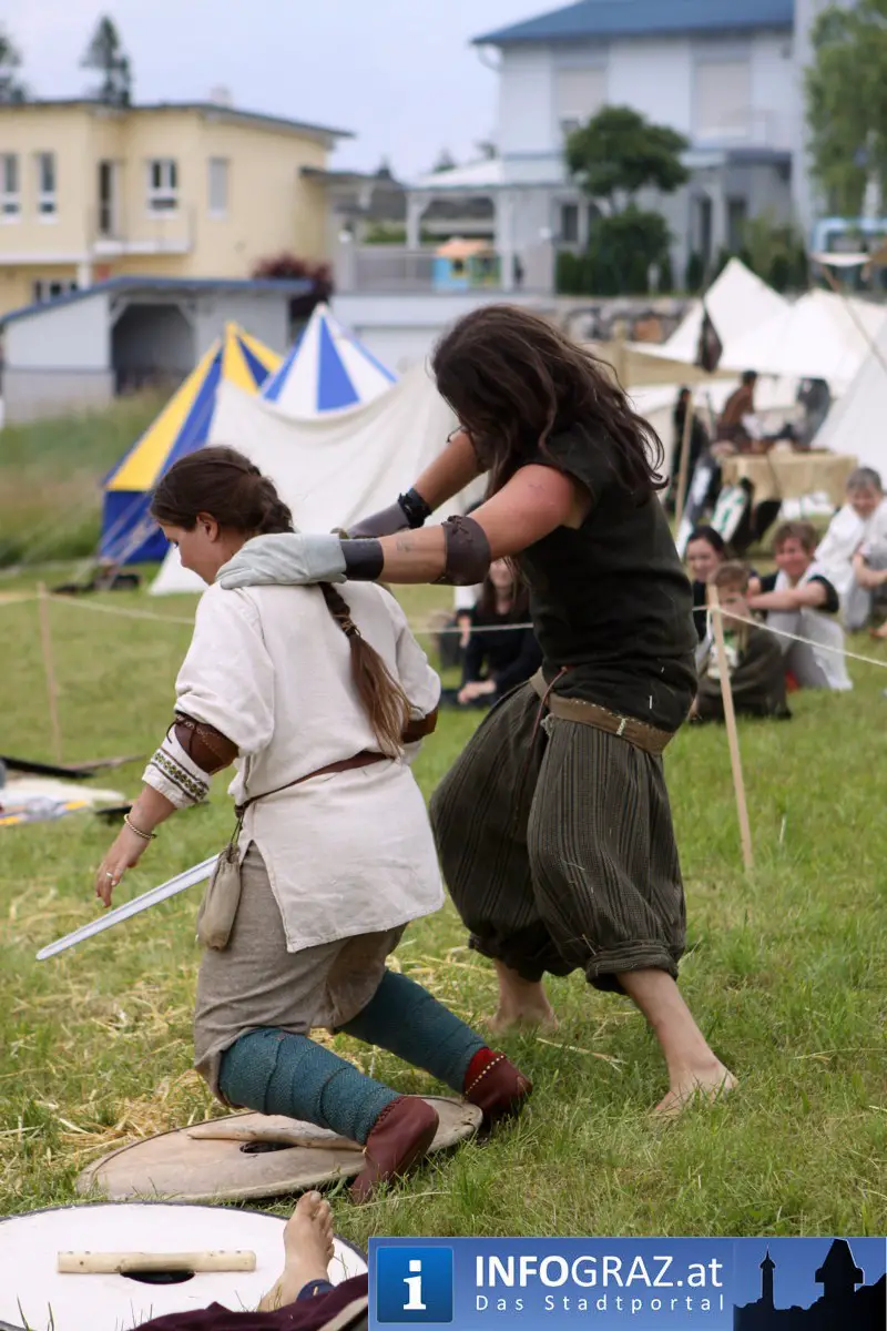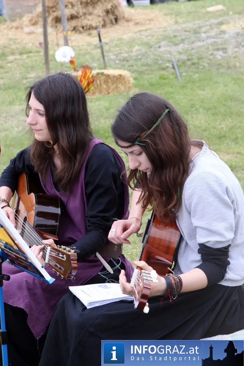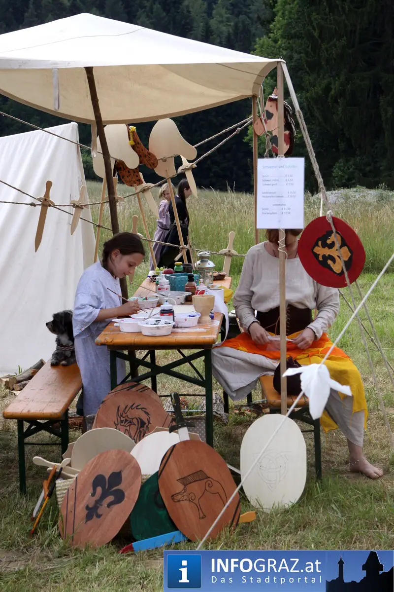 Während sich die Kinder vorbehaltlos mit dem Marionettentheater auf die Reise in eine ferne Zeit begaben, wurden die Erwachsenen mit dem herben Reiz mittelalterlicher Musik umgarnt… Eines sei schon vor Betrachten der Bilder auf INFOGRAZ.at vorweggenommen: unsere Männer von heute haben jedenfalls die vergangenen Jahrhunderte hindurch nichts an Muskelkraft und Kampfgeist eingebüßt, sei es beim Axt- und Speerwerfen, Bogen- oder Armbrustschießen oder gar beim Bruchenball-Turnier, wo mit vollem Körpereinsatz bis zum Umfallen gekämpft wurde!