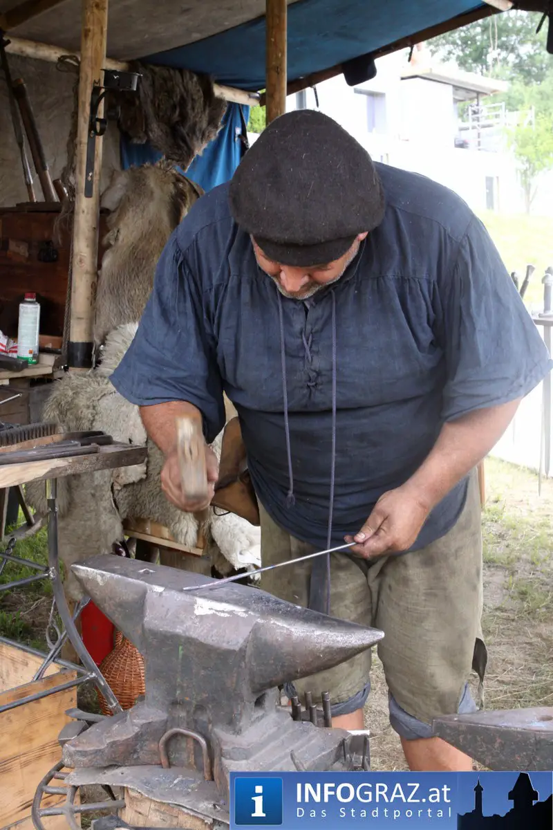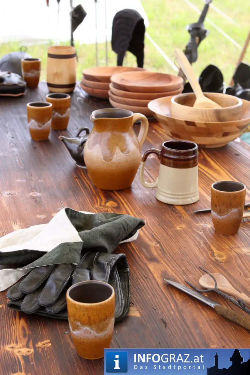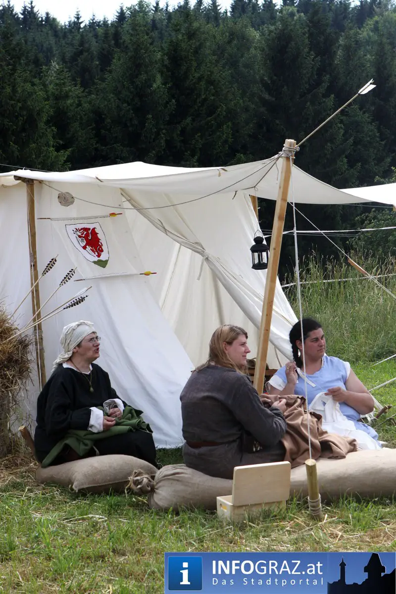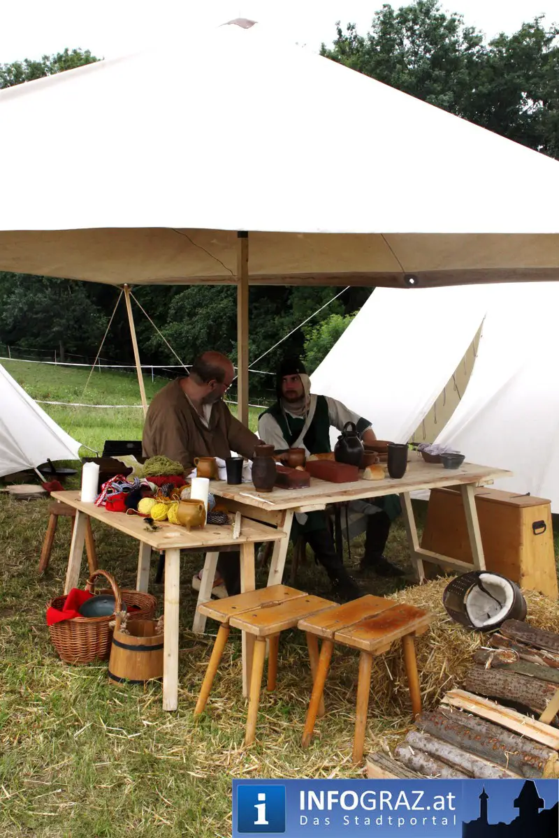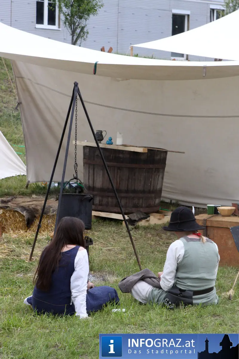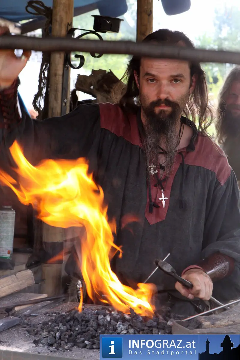 Während sich die Kinder vorbehaltlos mit dem Marionettentheater auf die Reise in eine ferne Zeit begaben, wurden die Erwachsenen mit dem herben Reiz mittelalterlicher Musik umgarnt… Eines sei schon vor Betrachten der Bilder auf INFOGRAZ.at vorweggenommen: unsere Männer von heute haben jedenfalls die vergangenen Jahrhunderte hindurch nichts an Muskelkraft und Kampfgeist eingebüßt, sei es beim Axt- und Speerwerfen, Bogen- oder Armbrustschießen oder gar beim Bruchenball-Turnier, wo mit vollem Körpereinsatz bis zum Umfallen gekämpft wurde!
