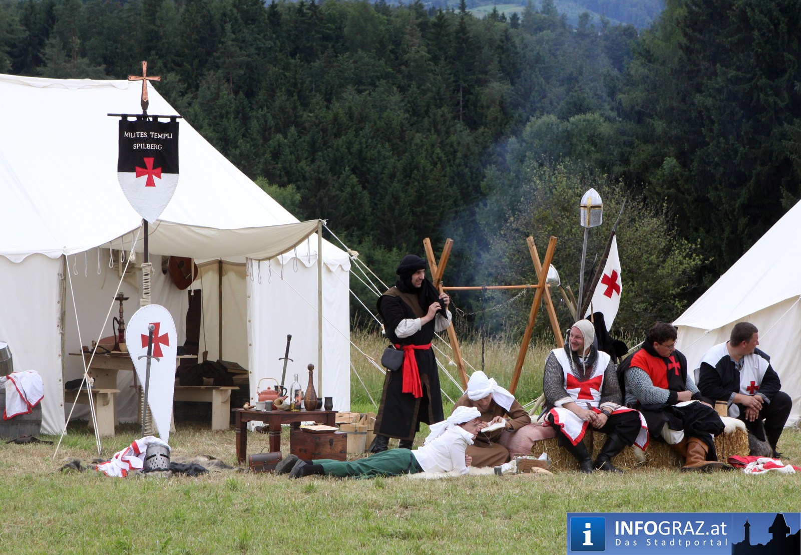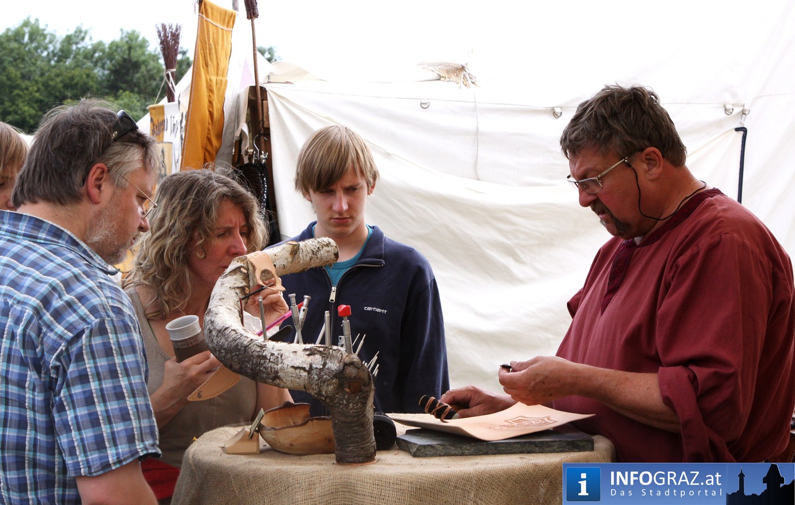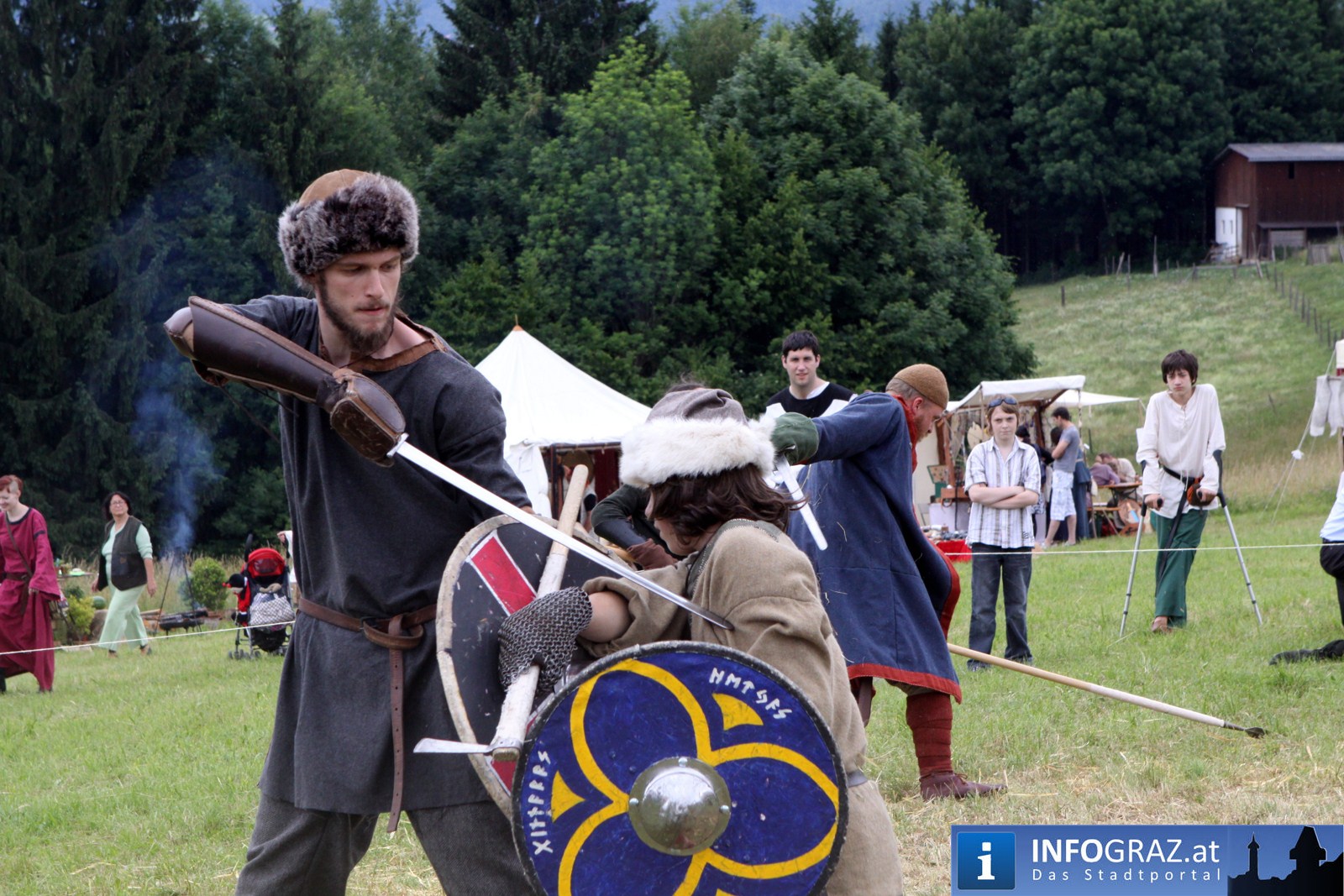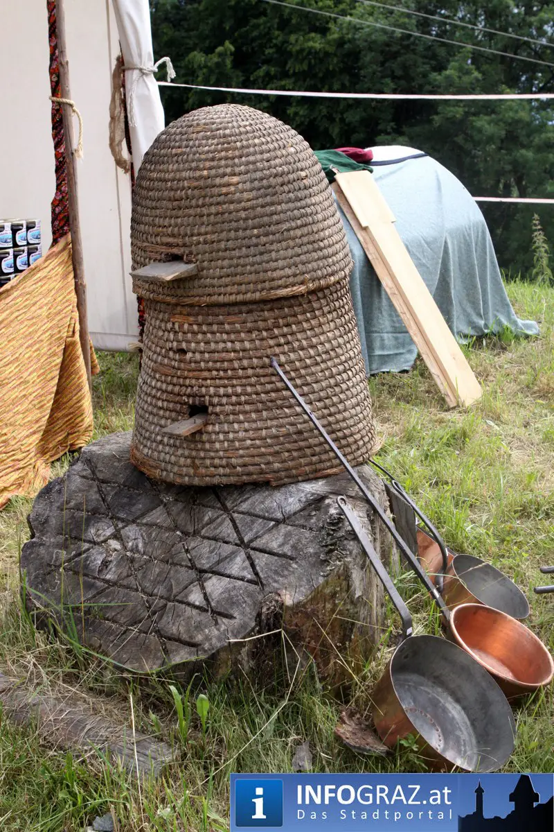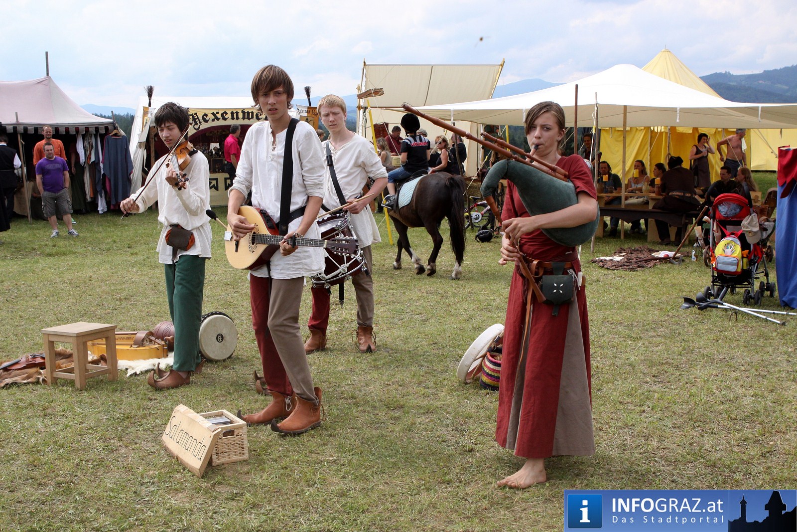 Während sich die Kinder vorbehaltlos mit dem Marionettentheater auf die Reise in eine ferne Zeit begaben, wurden die Erwachsenen mit dem herben Reiz mittelalterlicher Musik umgarnt… Eines sei schon vor Betrachten der Bilder auf INFOGRAZ.at vorweggenommen: unsere Männer von heute haben jedenfalls die vergangenen Jahrhunderte hindurch nichts an Muskelkraft und Kampfgeist eingebüßt, sei es beim Axt- und Speerwerfen, Bogen- oder Armbrustschießen oder gar beim Bruchenball-Turnier, wo mit vollem Körpereinsatz bis zum Umfallen gekämpft wurde!