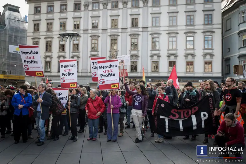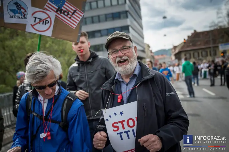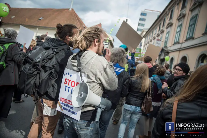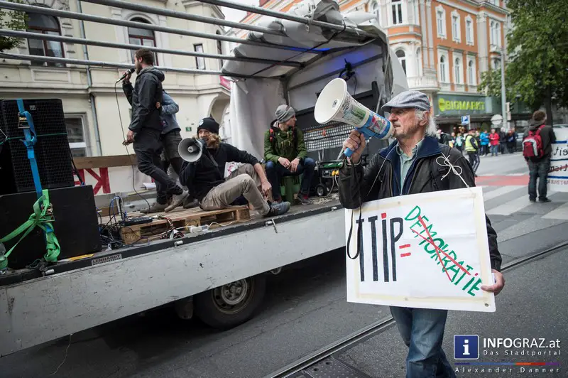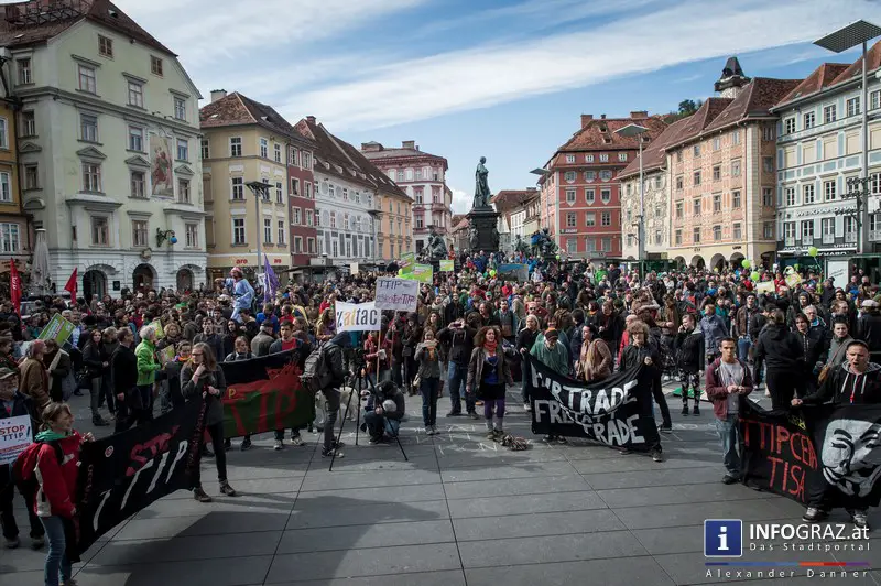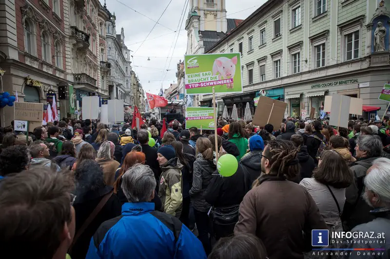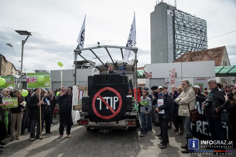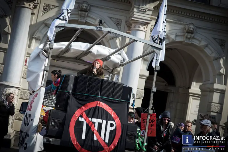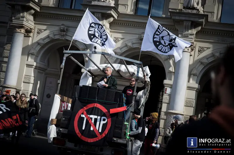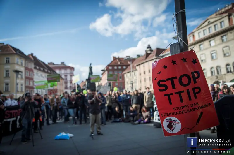 In Graz waren es nach Veranstalterangaben über 3:000. Mehrere Zusammenschlüsse wie das "Aktionsbündnis Graz", „TTIP-STOPPEN", oder die "Selbsorganisierte Europäische Bürgerinitiative gegen TTIP und CETA" hatten gemeinsam mit zahlreichen NGOs zu den Protesten aufgerufen.