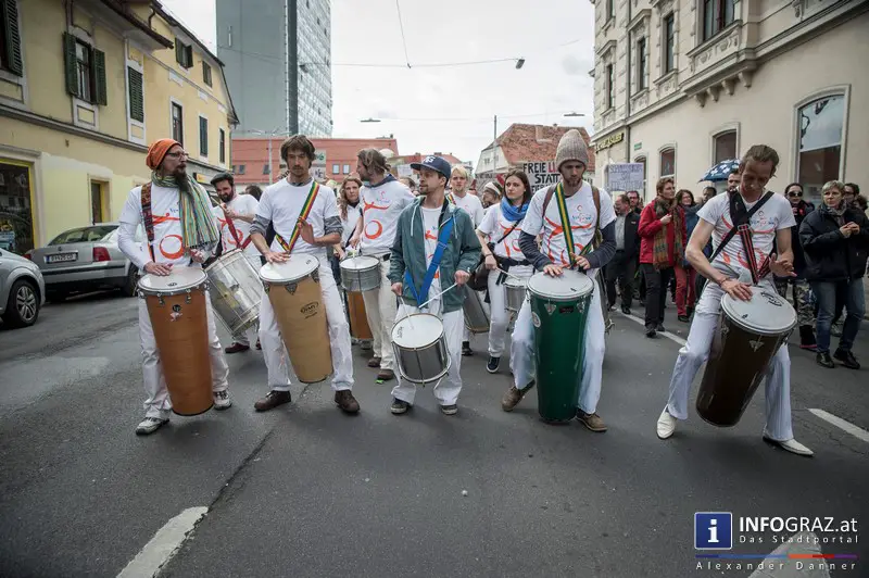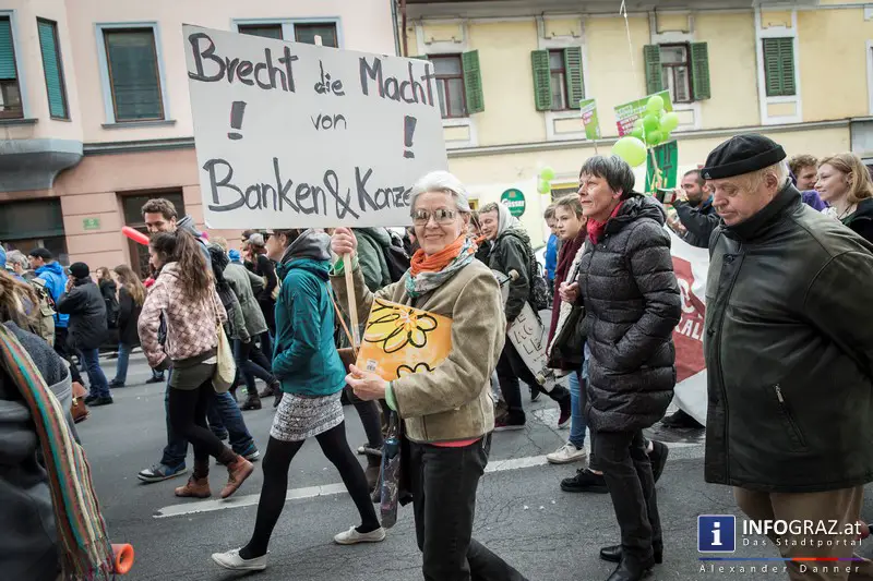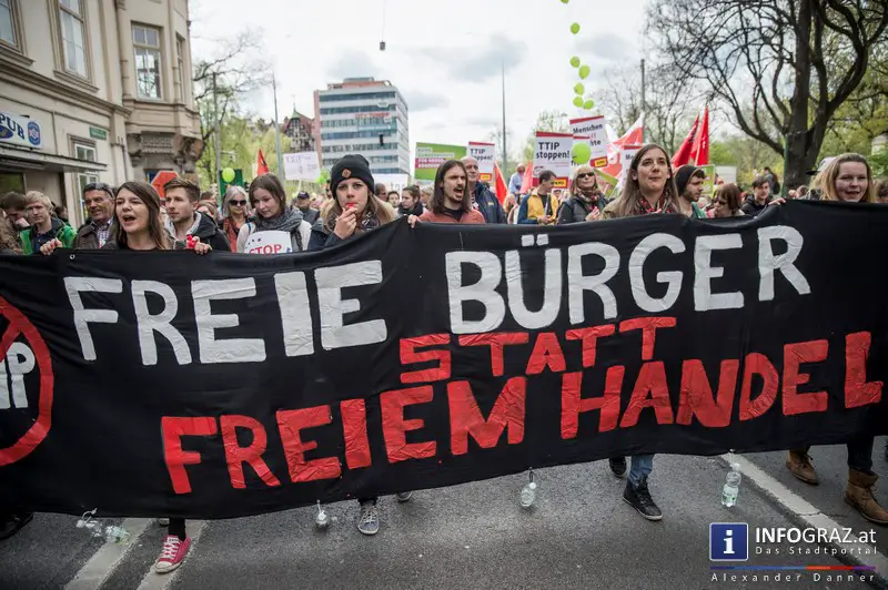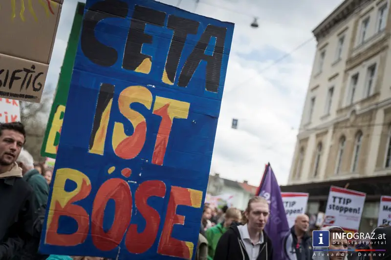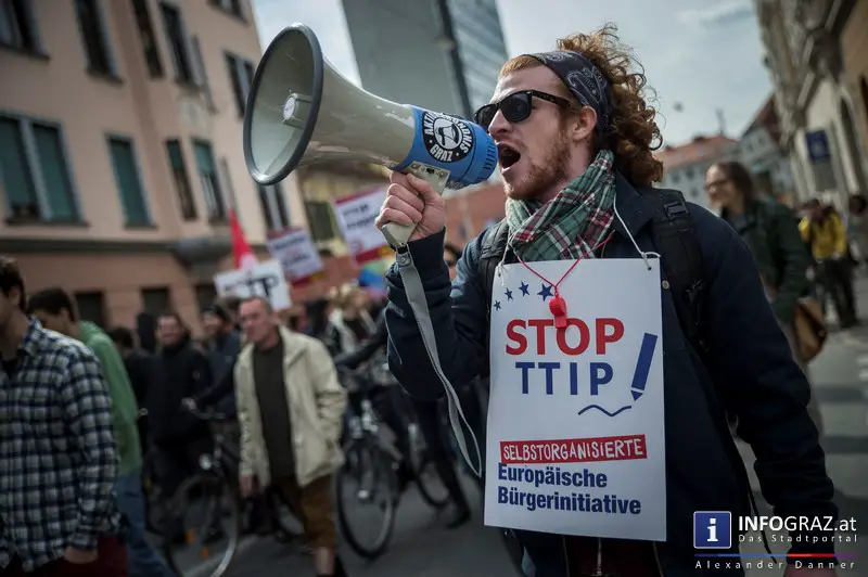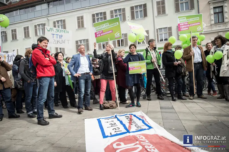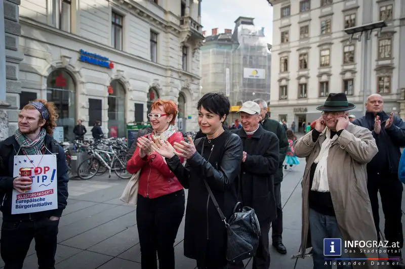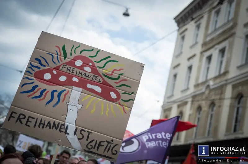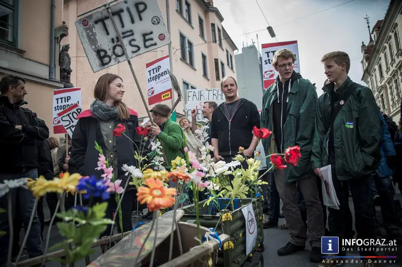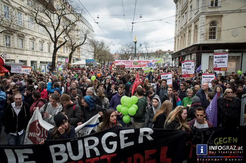 In Graz waren es nach Veranstalterangaben über 3:000. Mehrere Zusammenschlüsse wie das "Aktionsbündnis Graz", „TTIP-STOPPEN", oder die "Selbsorganisierte Europäische Bürgerinitiative gegen TTIP und CETA" hatten gemeinsam mit zahlreichen NGOs zu den Protesten aufgerufen.
