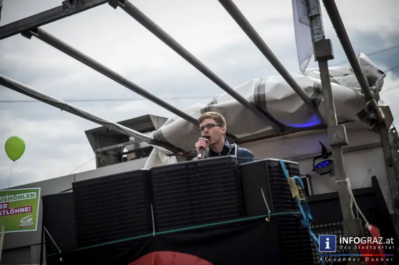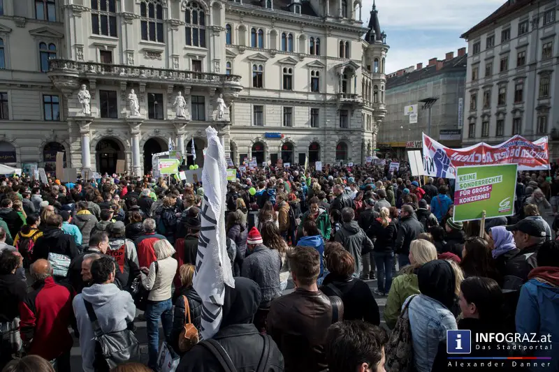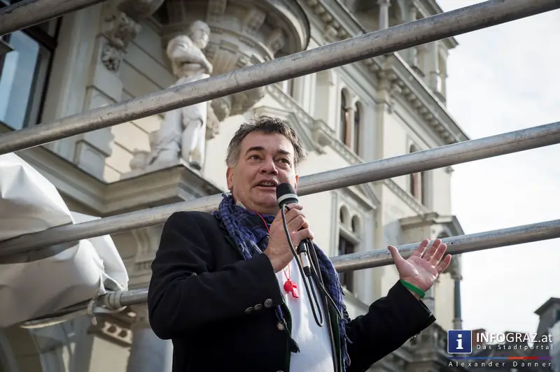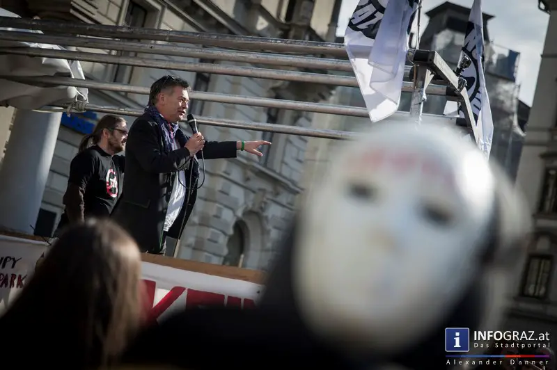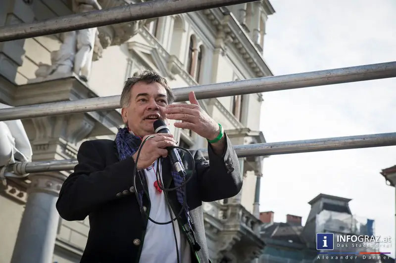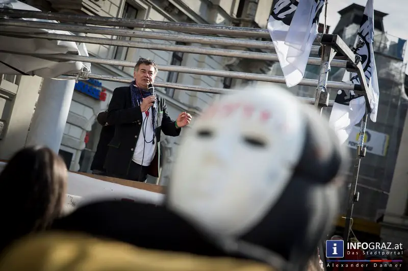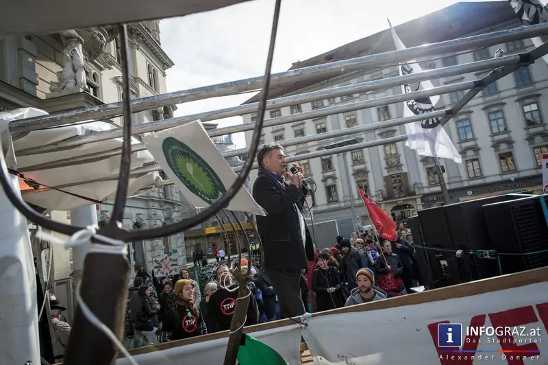 Zum Auftakt der Demonstration am Griesplatz wies der Grazer Gemeinderat Robert Krotzer (KPÖ) darauf hin „dass soziale Standards, die Grundversorgung mit Dienstleistungen, öffentliches Eigentum, Umweltauflagen, Verbraucher- und Datenschutz, ökonomische Entwicklung und demokratische Kontrolle in Gefahr sind“.