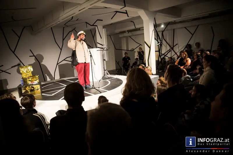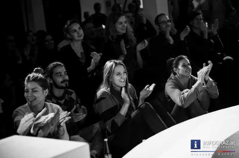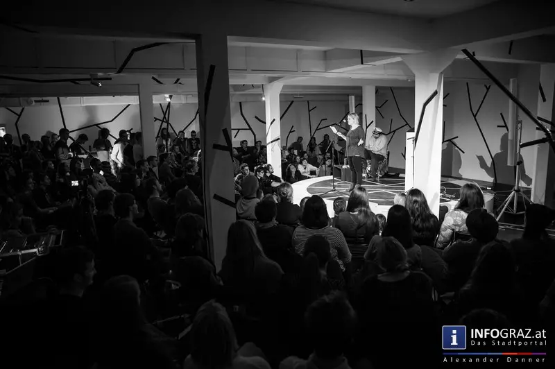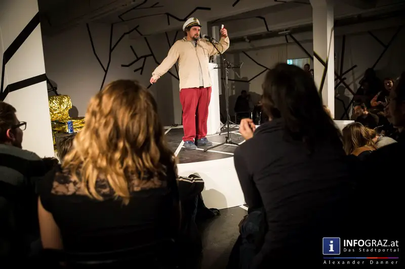 Und weil der Ansturm, wie zu erwarten, für die Jubiläumsveranstaltung des beliebten Dicht-Wettstreits enorm war, wurde das Spektakel in das nicht unweit gelegene Künstlerhaus KM- Halle für Kunst & Medien verlegt.