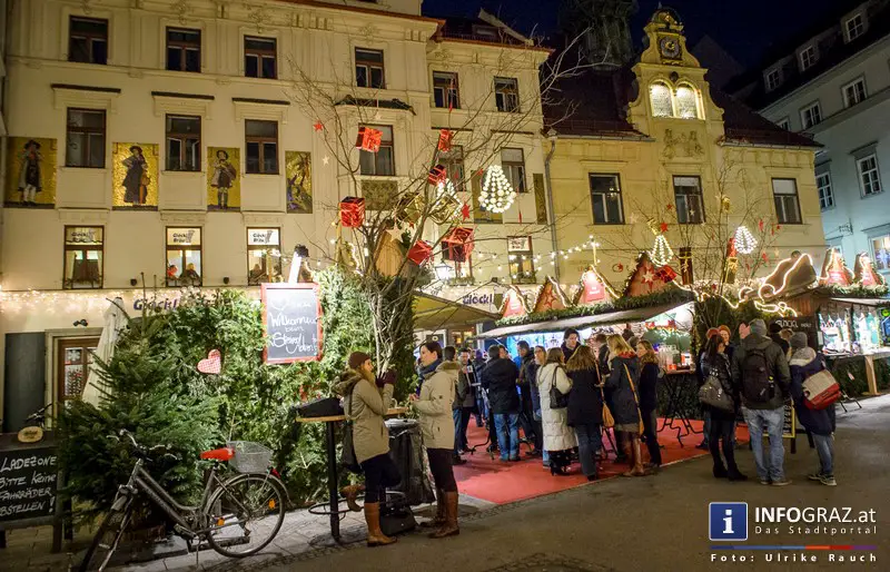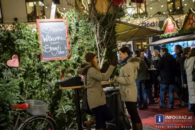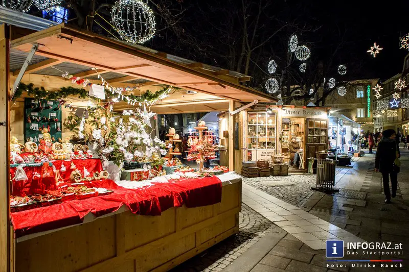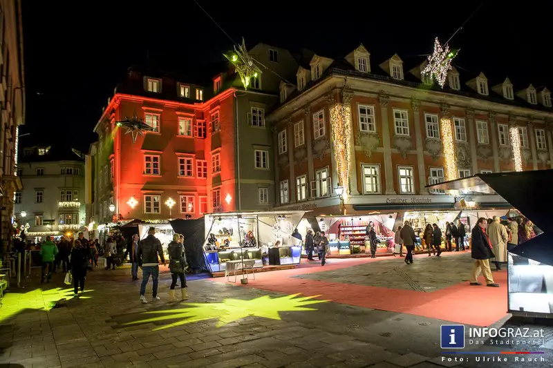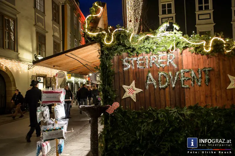 Die Design-Adventhütten am Mehlplatz zeigen tagsüber erlesenes Kunsthandwerk, bei Nacht wirken sie wie leuchtende Kristalle. Der Adventmarkt am Glockenspielplatz wiederum steht auch heuer wieder unter dem Motto „Steiermark“.