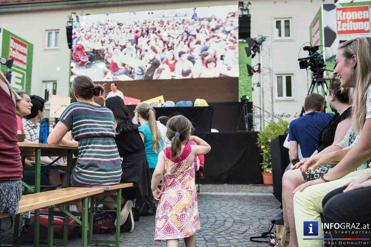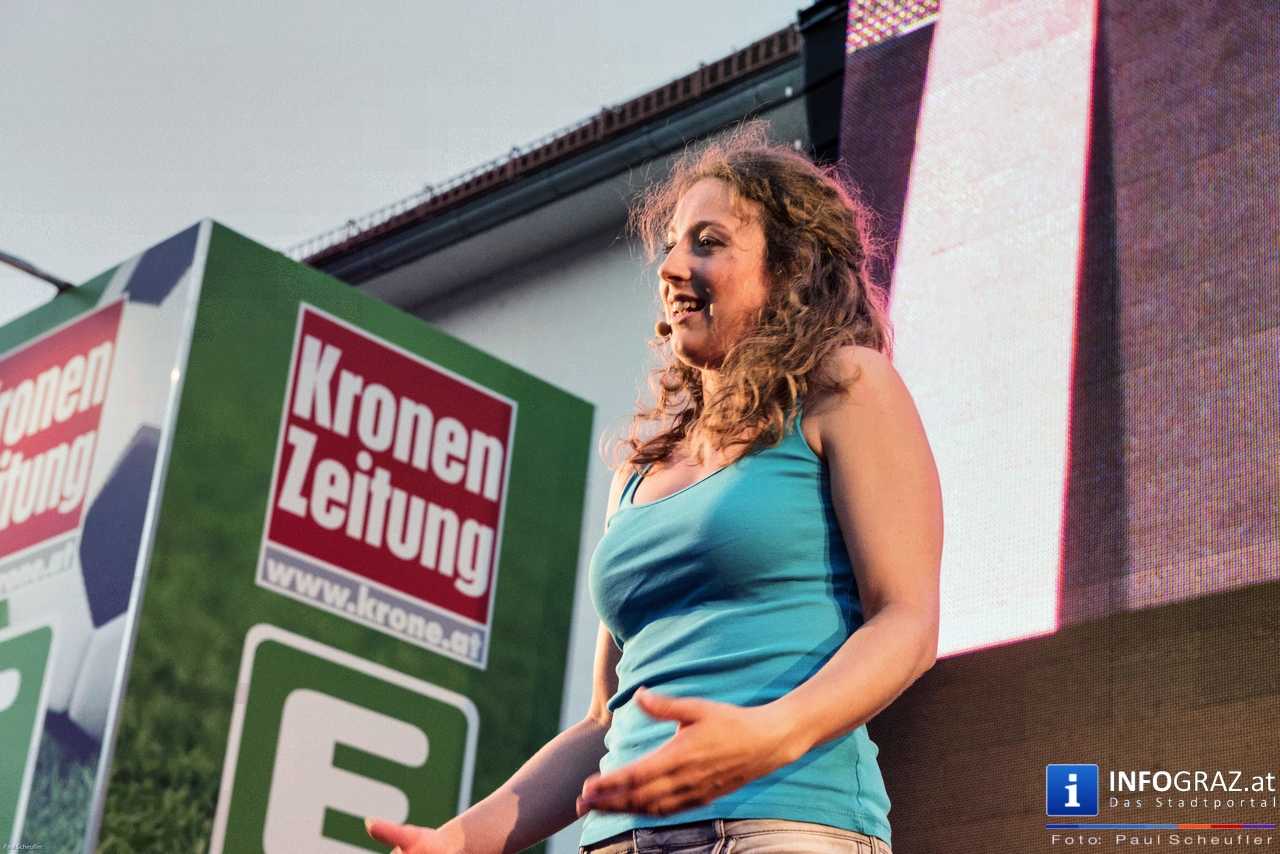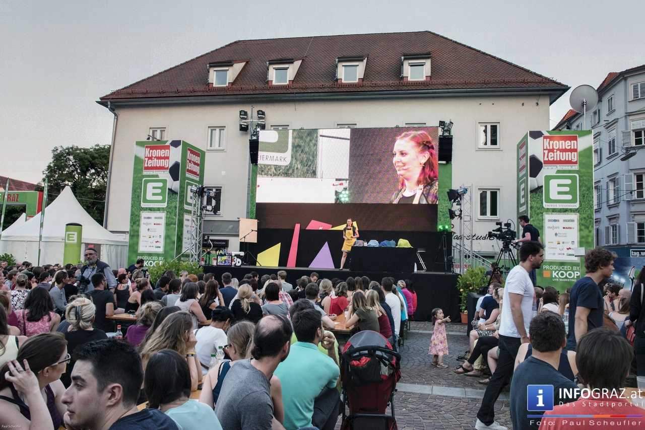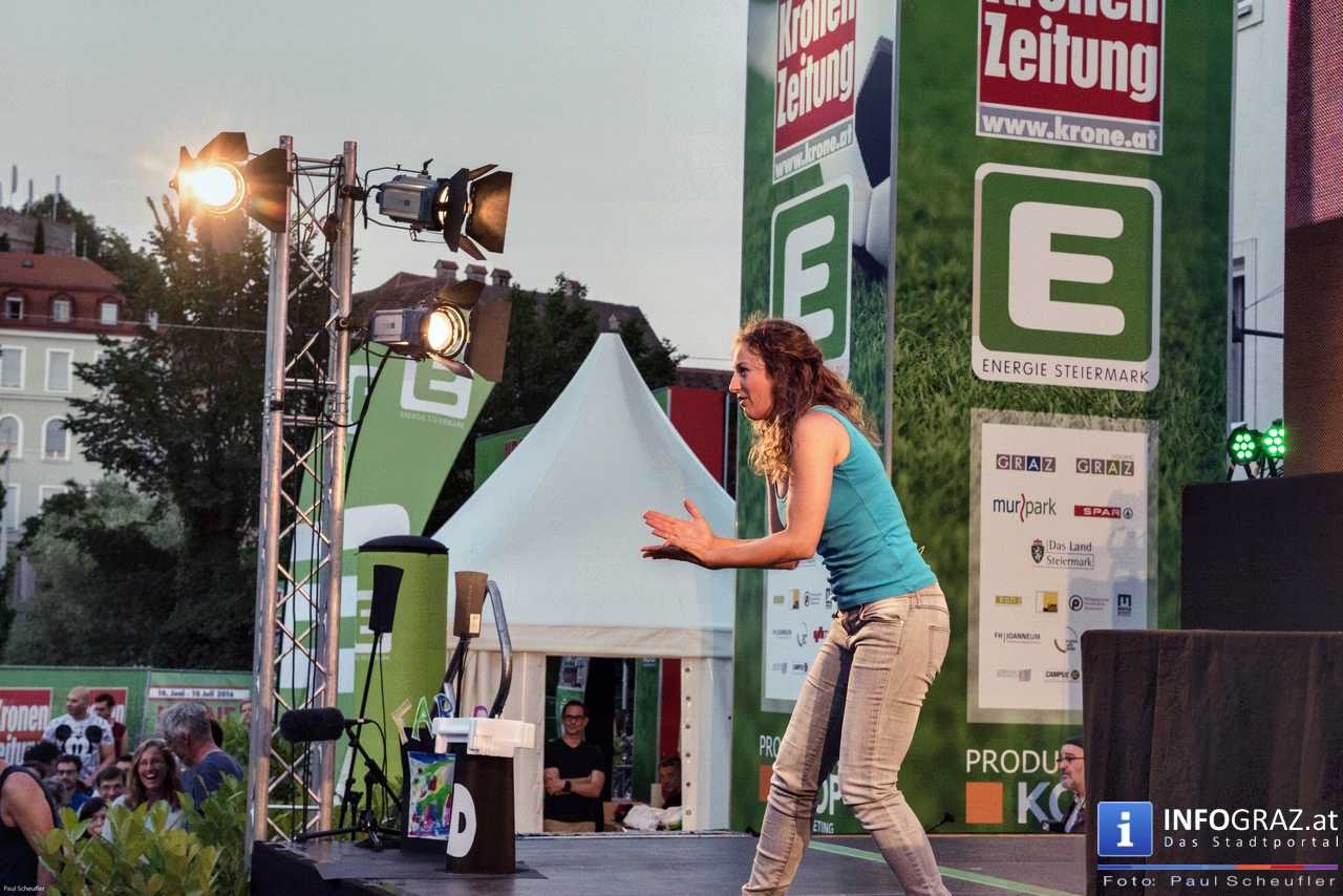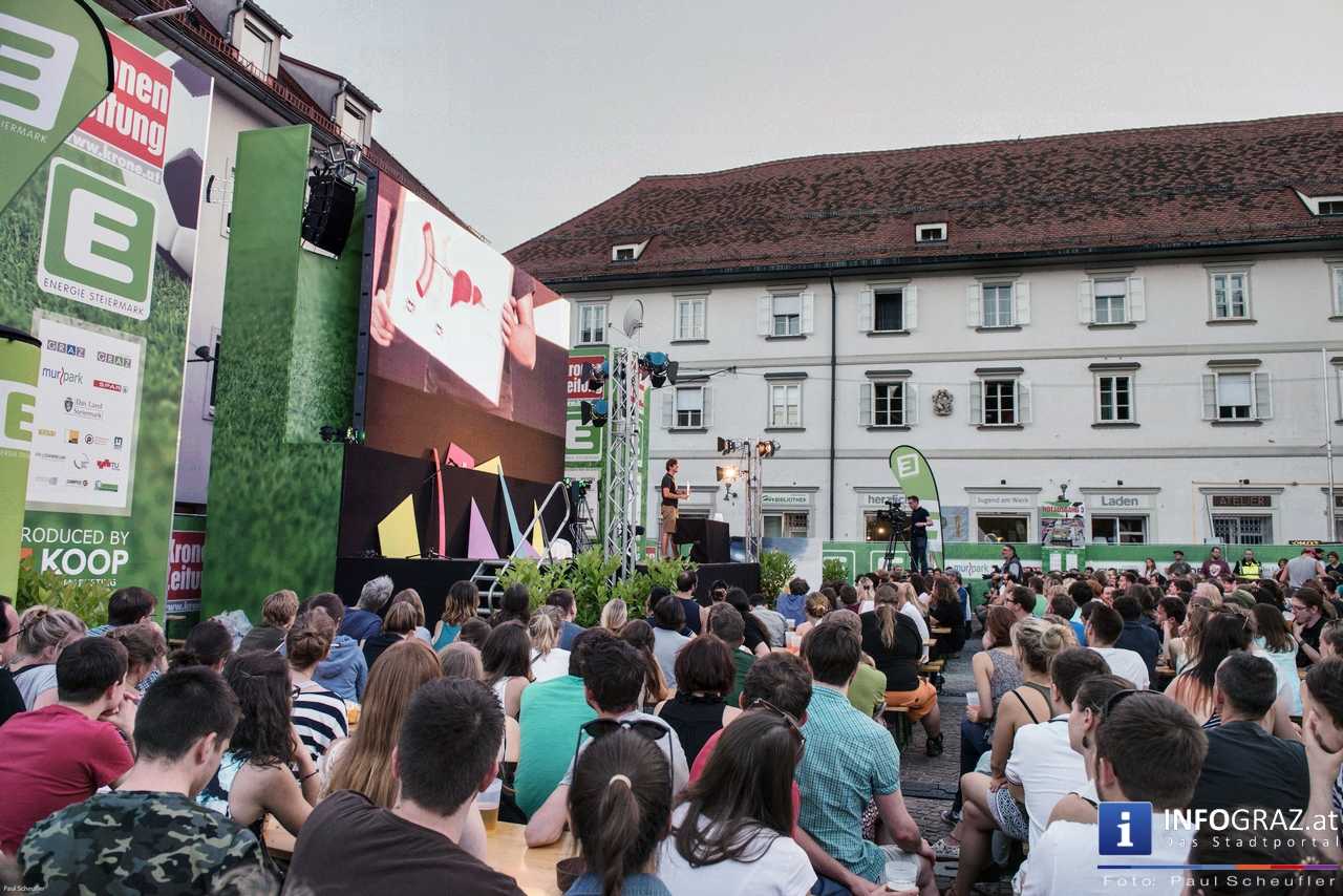Während eines fußballfreien Tages verwandelt sich die EM-Public-Viewing-Area am Mariahilferplatz zur Bühne des steirischen sience slam. Bei diesem Event haben nominierte Kandidaten und Kandidatinnen 6 Minuten Zeit, ihre eigene Forschung so verständlich wie möglich zu präsentieren. Dabei ist von Schauspiel über Requisiten und Musikeinspielungen fast alles erlaubt. Am Ende gilt es, die 850 Zuseher bzw. Zuseherinnen von sich und seiner Arbeit zu überzeugen.