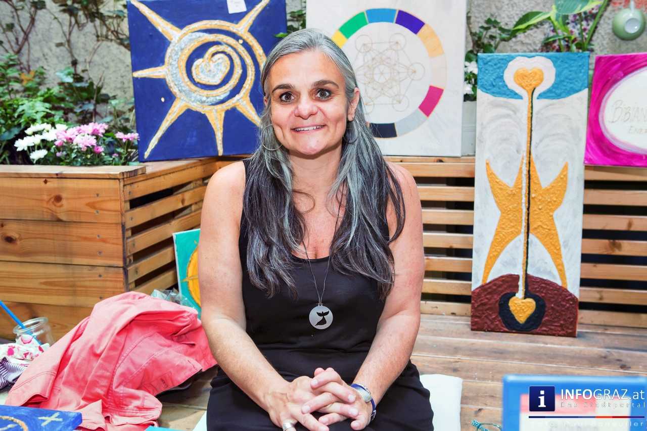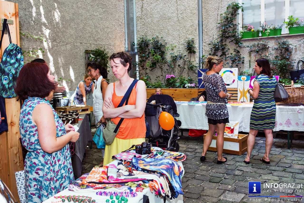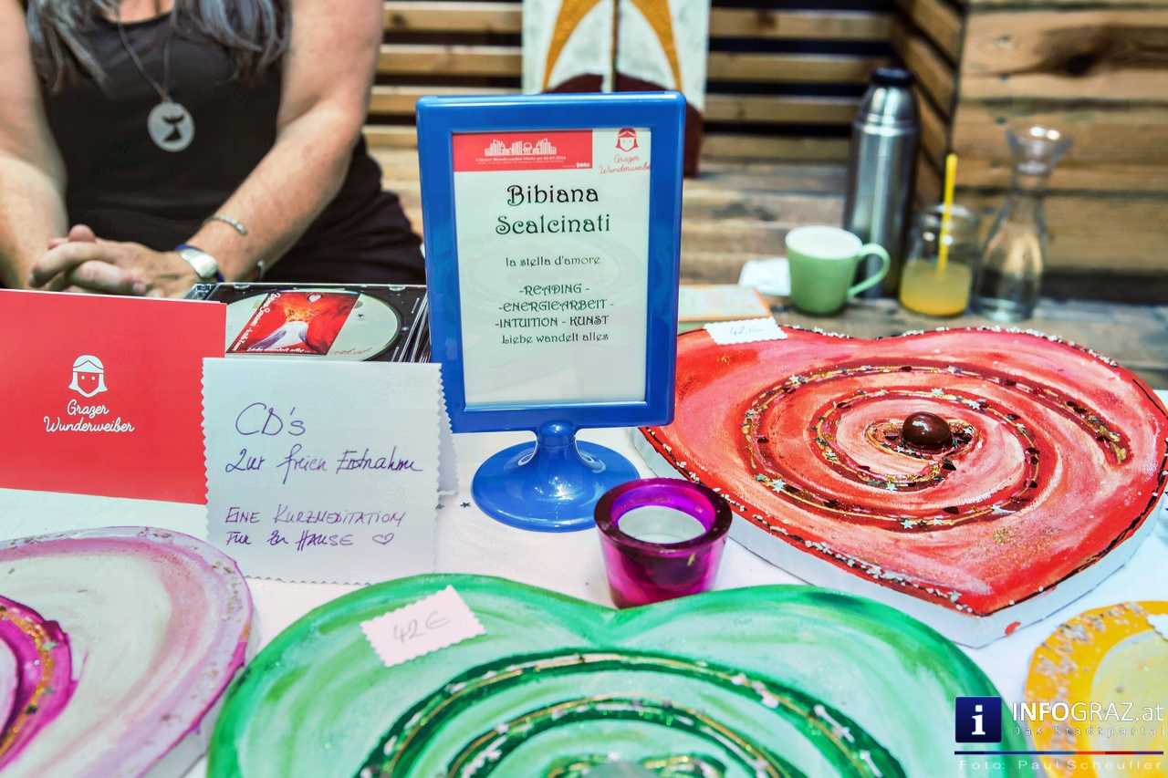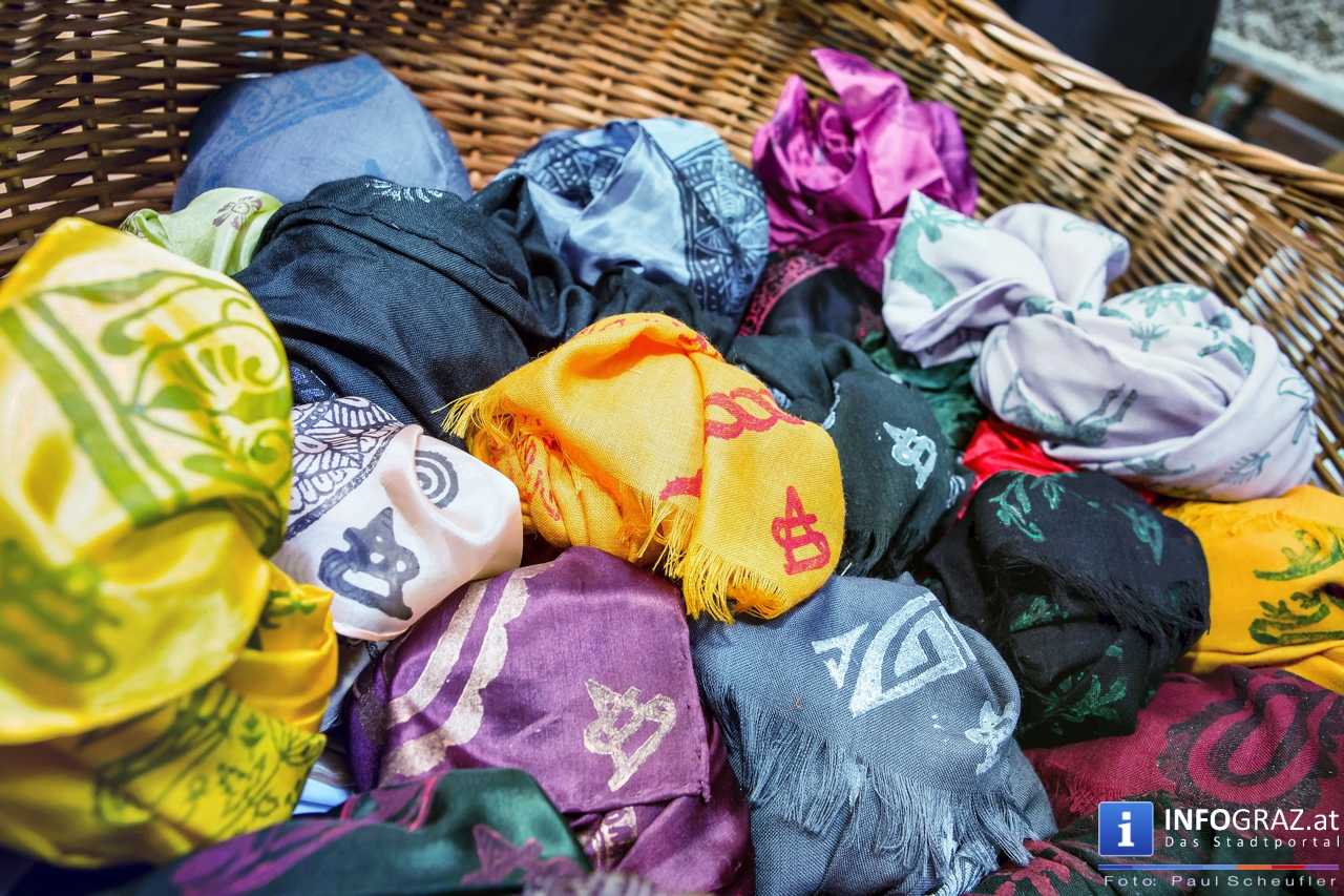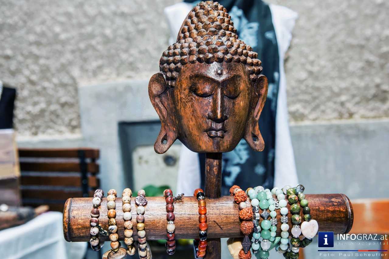 Bilder mit esoterischer Botschaft, Tücher, Schals, Handtaschen, Schmuck, Kinderspielzeug – ein großes Angebot in der Griesgasse und im schattigen Innenhof von PARKS-Art, wo FRAU sich von der Hitze draußen erholen konnte.