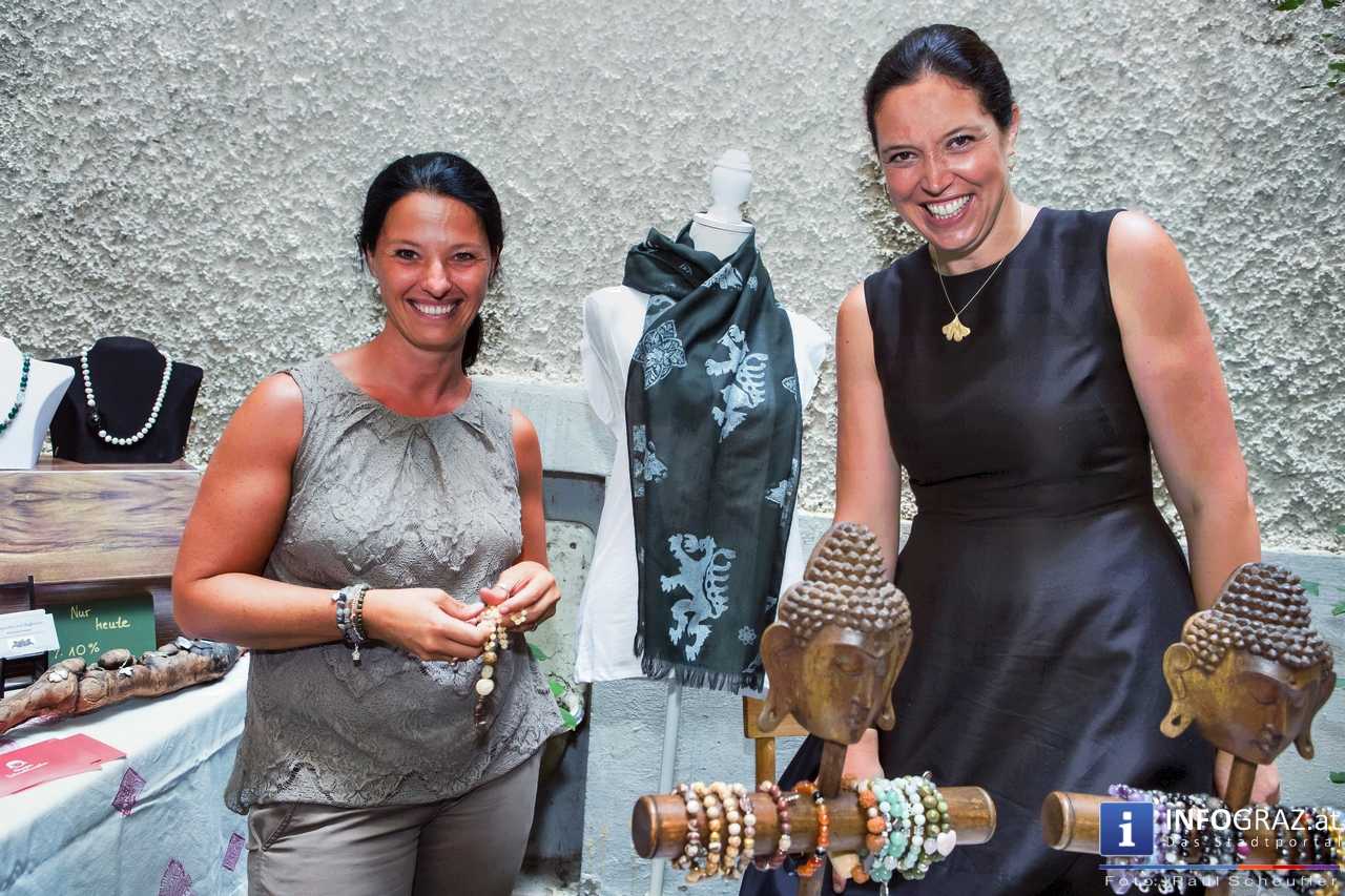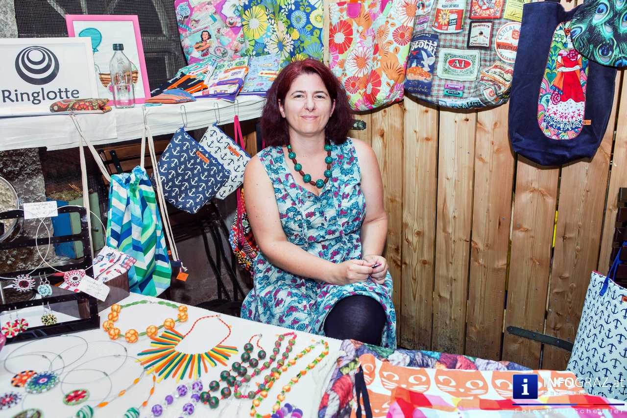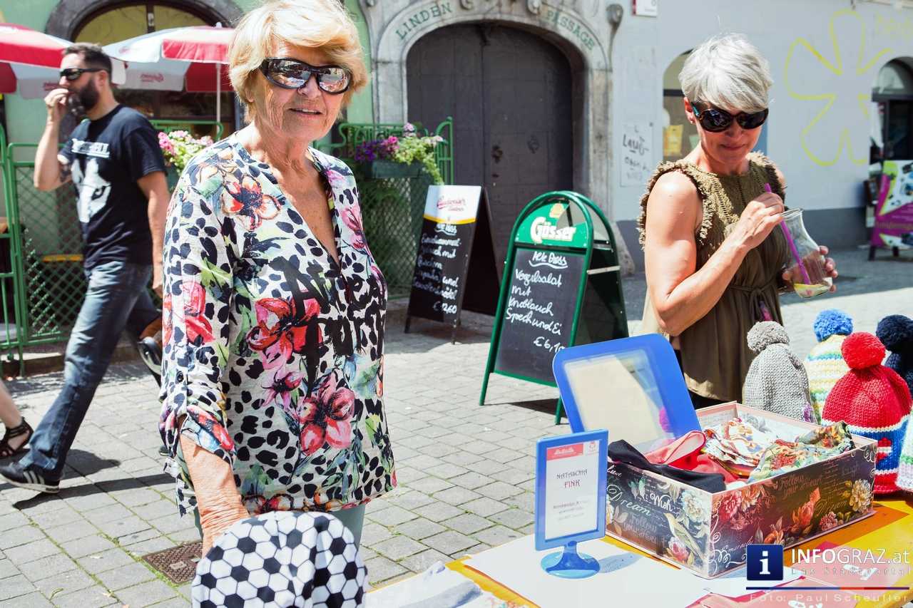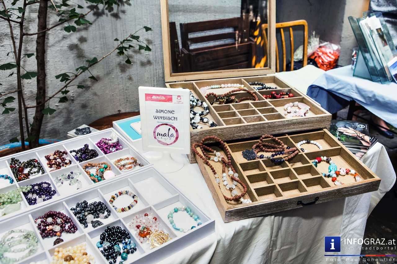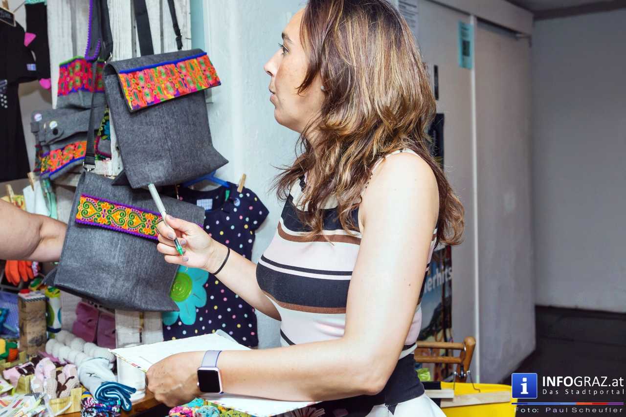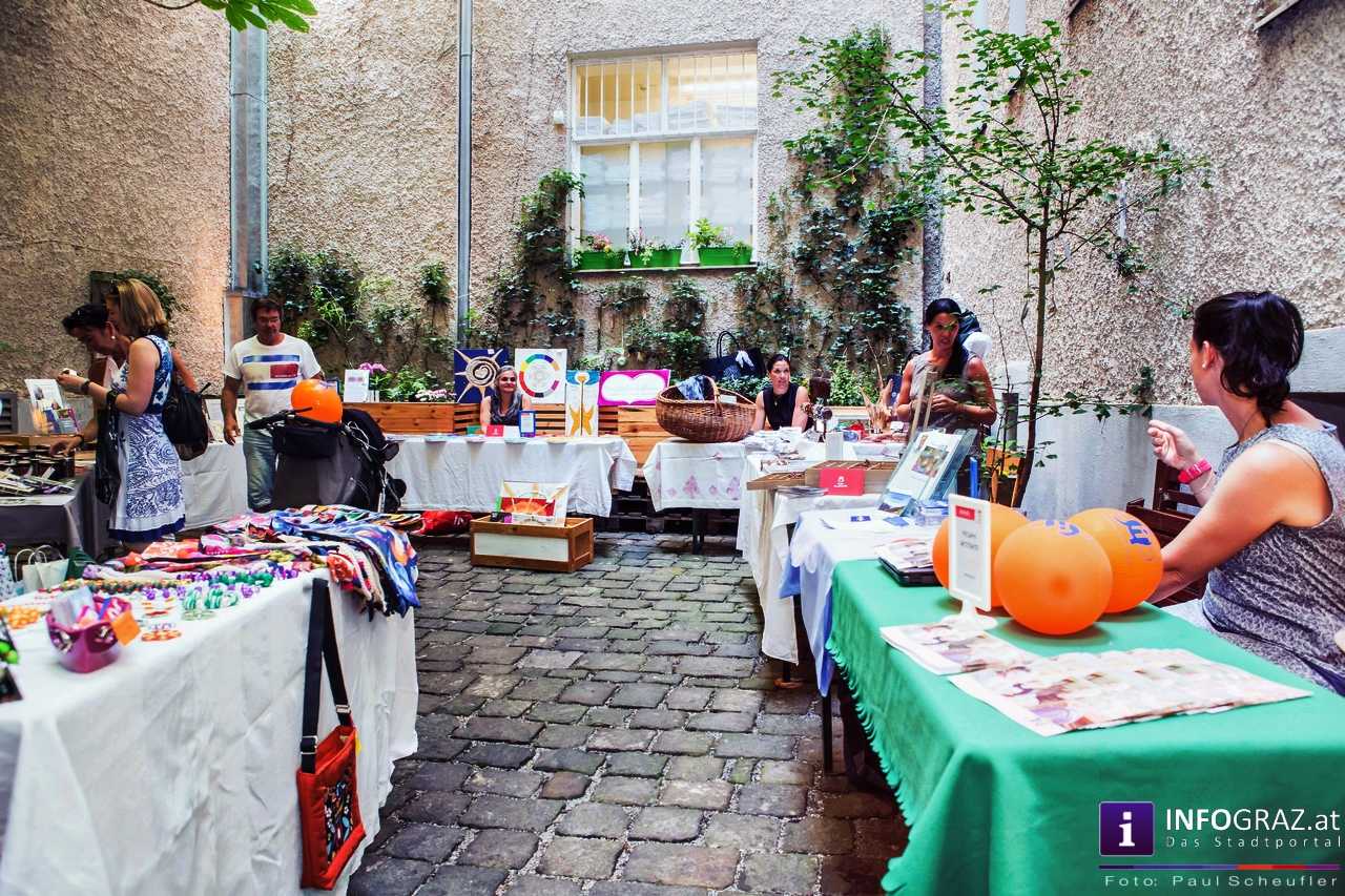 Bilder mit esoterischer Botschaft, Tücher, Schals, Handtaschen, Schmuck, Kinderspielzeug – ein großes Angebot in der Griesgasse und im schattigen Innenhof von PARKS-Art, wo FRAU sich von der Hitze draußen erholen konnte.
