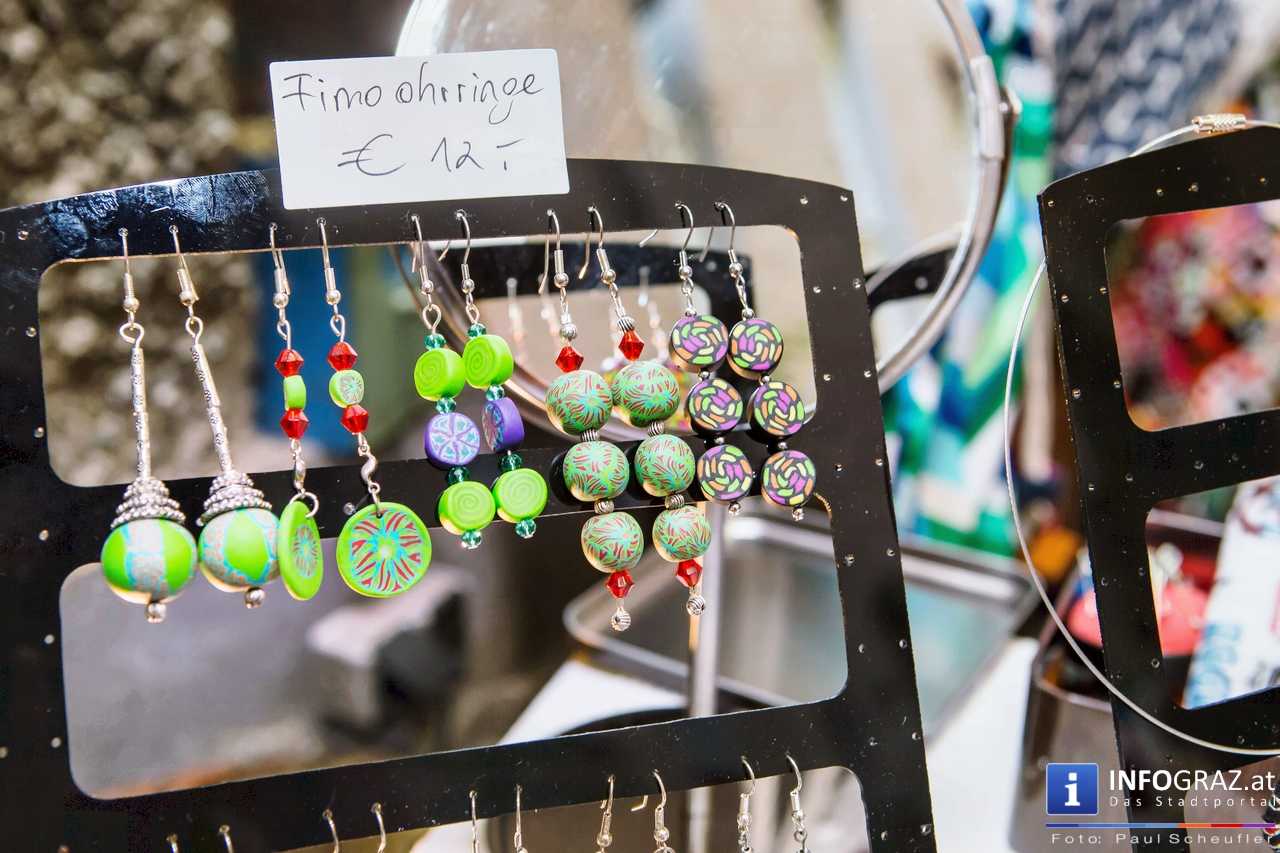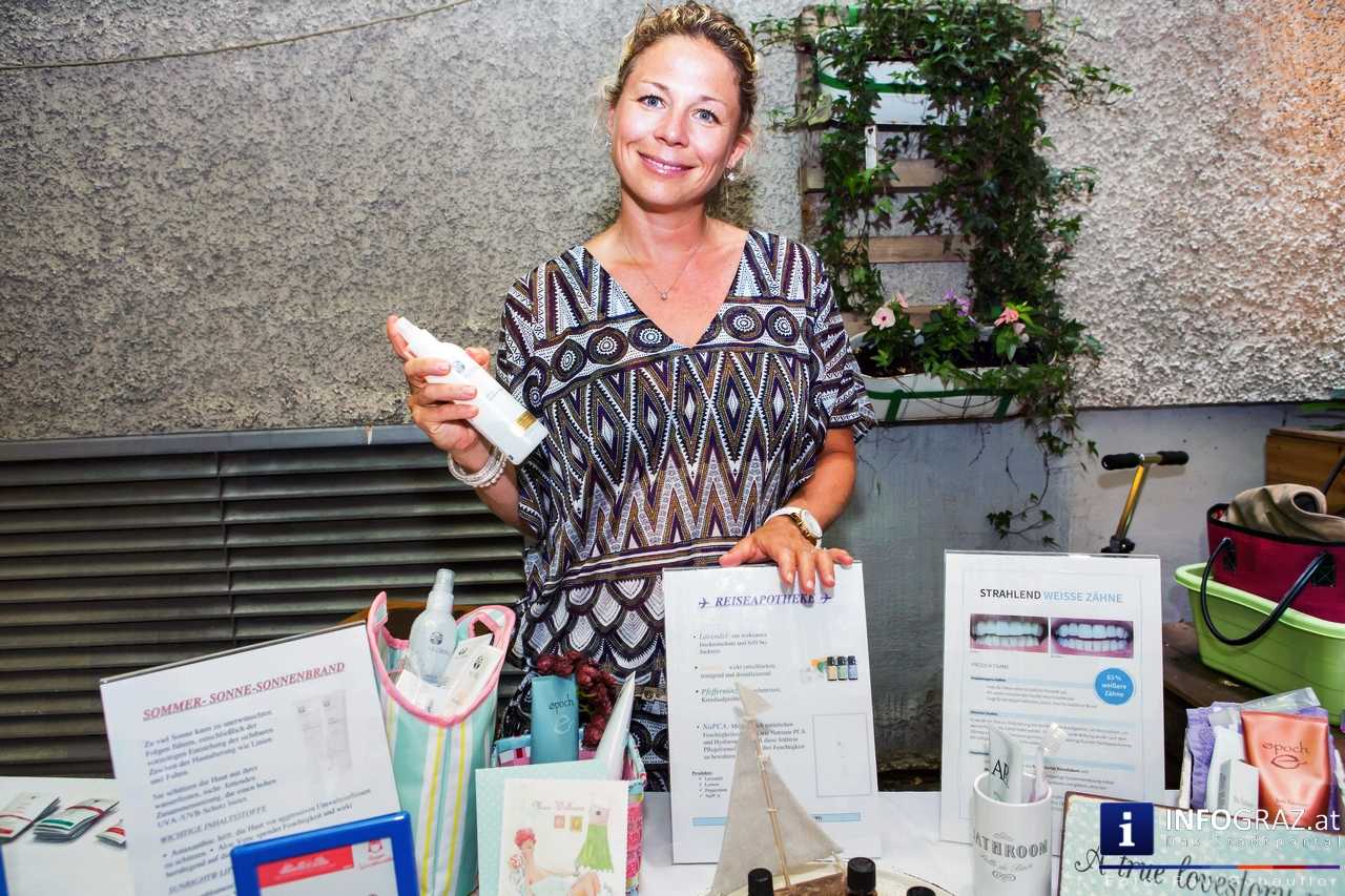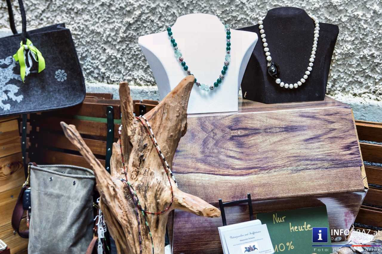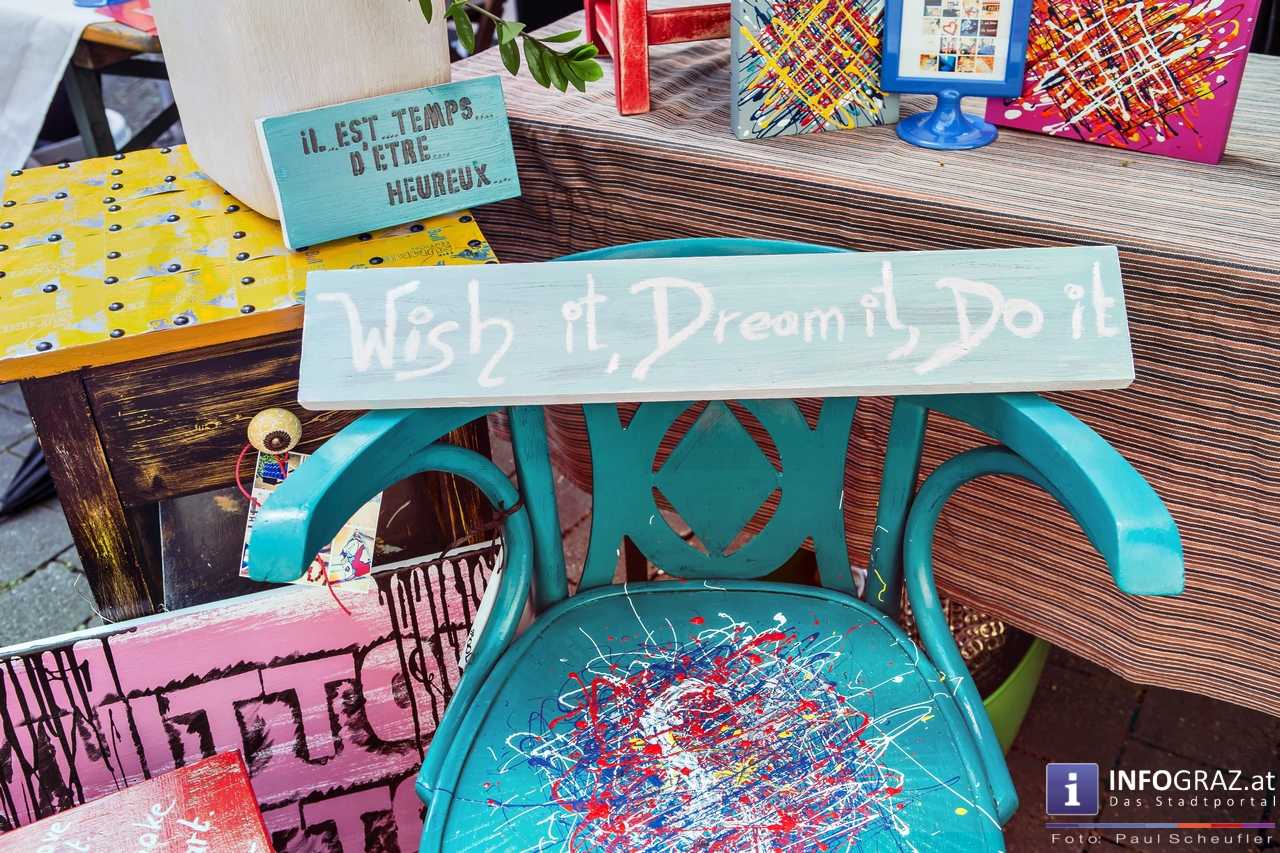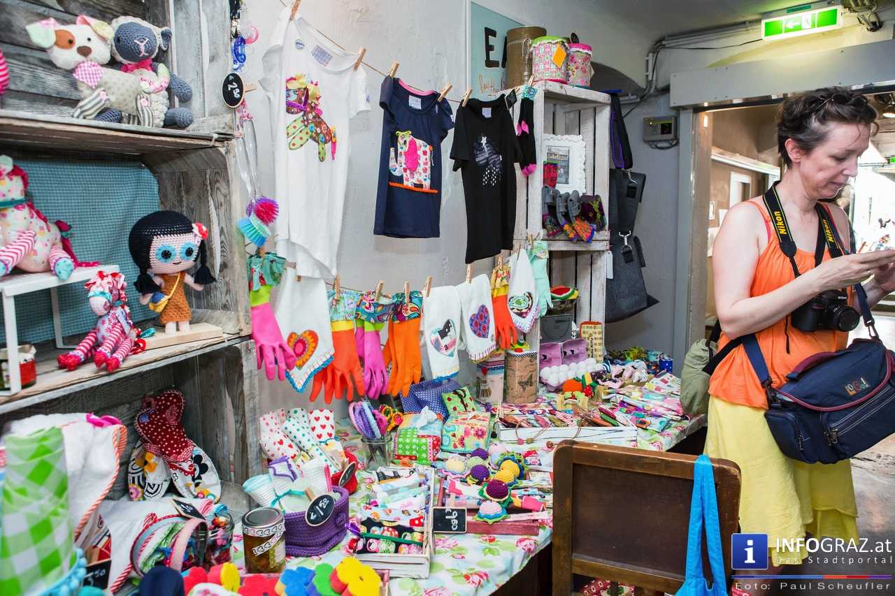 Bilder mit esoterischer Botschaft, Tücher, Schals, Handtaschen, Schmuck, Kinderspielzeug – ein großes Angebot in der Griesgasse und im schattigen Innenhof von PARKS-Art, wo FRAU sich von der Hitze draußen erholen konnte.