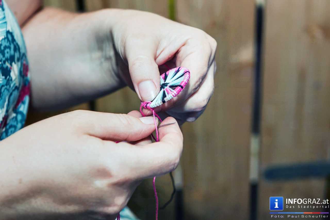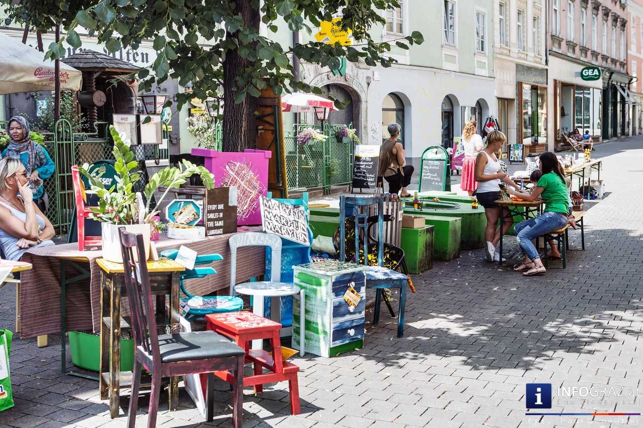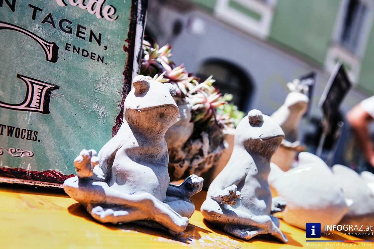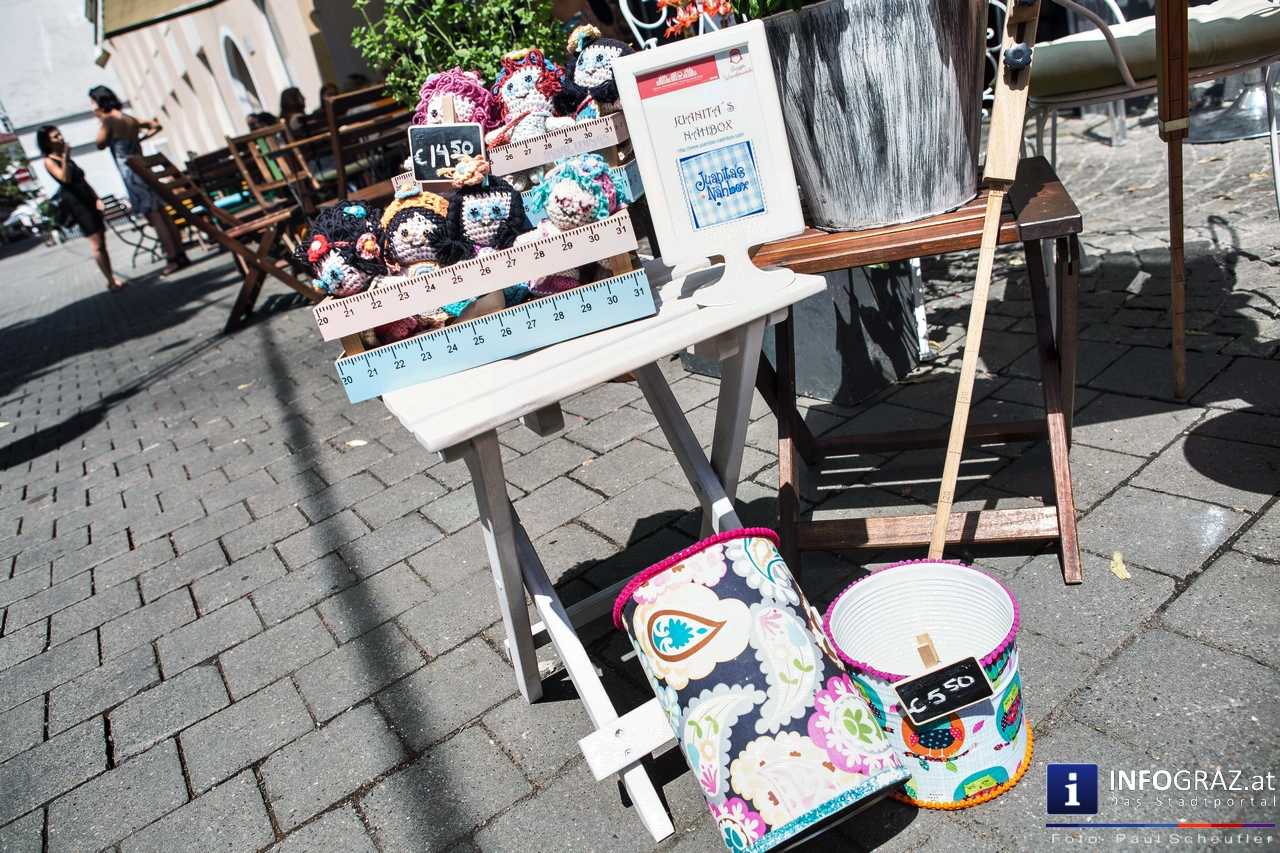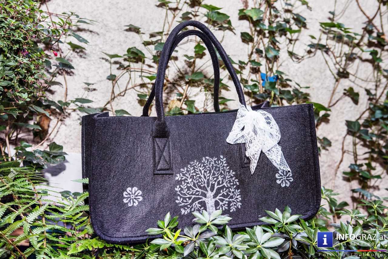 Bilder mit esoterischer Botschaft, Tücher, Schals, Handtaschen, Schmuck, Kinderspielzeug – ein großes Angebot in der Griesgasse und im schattigen Innenhof von PARKS-Art, wo FRAU sich von der Hitze draußen erholen konnte.