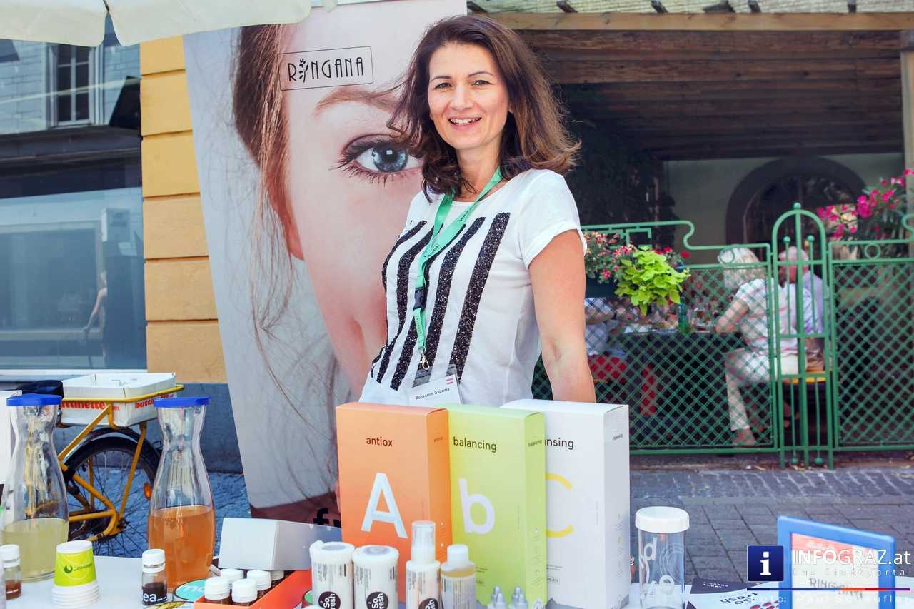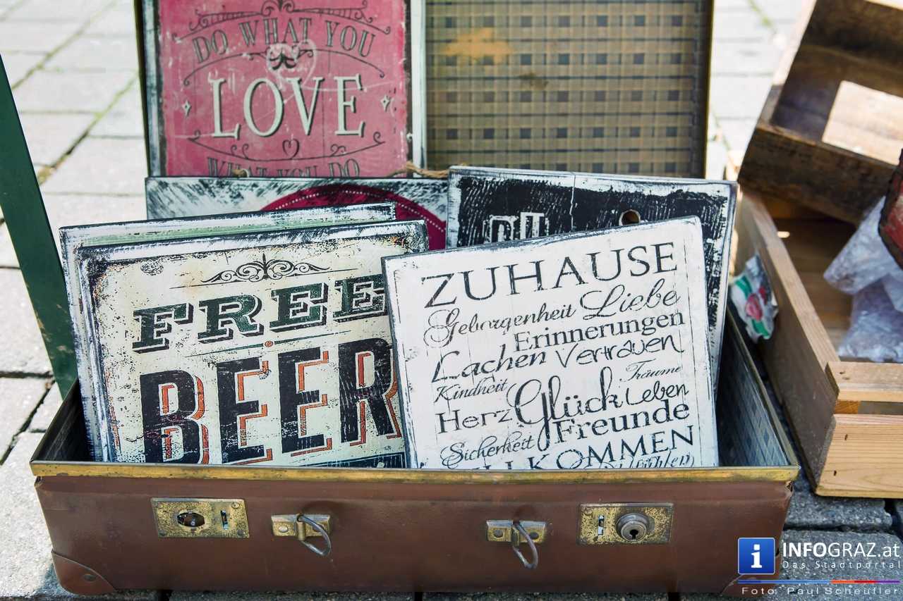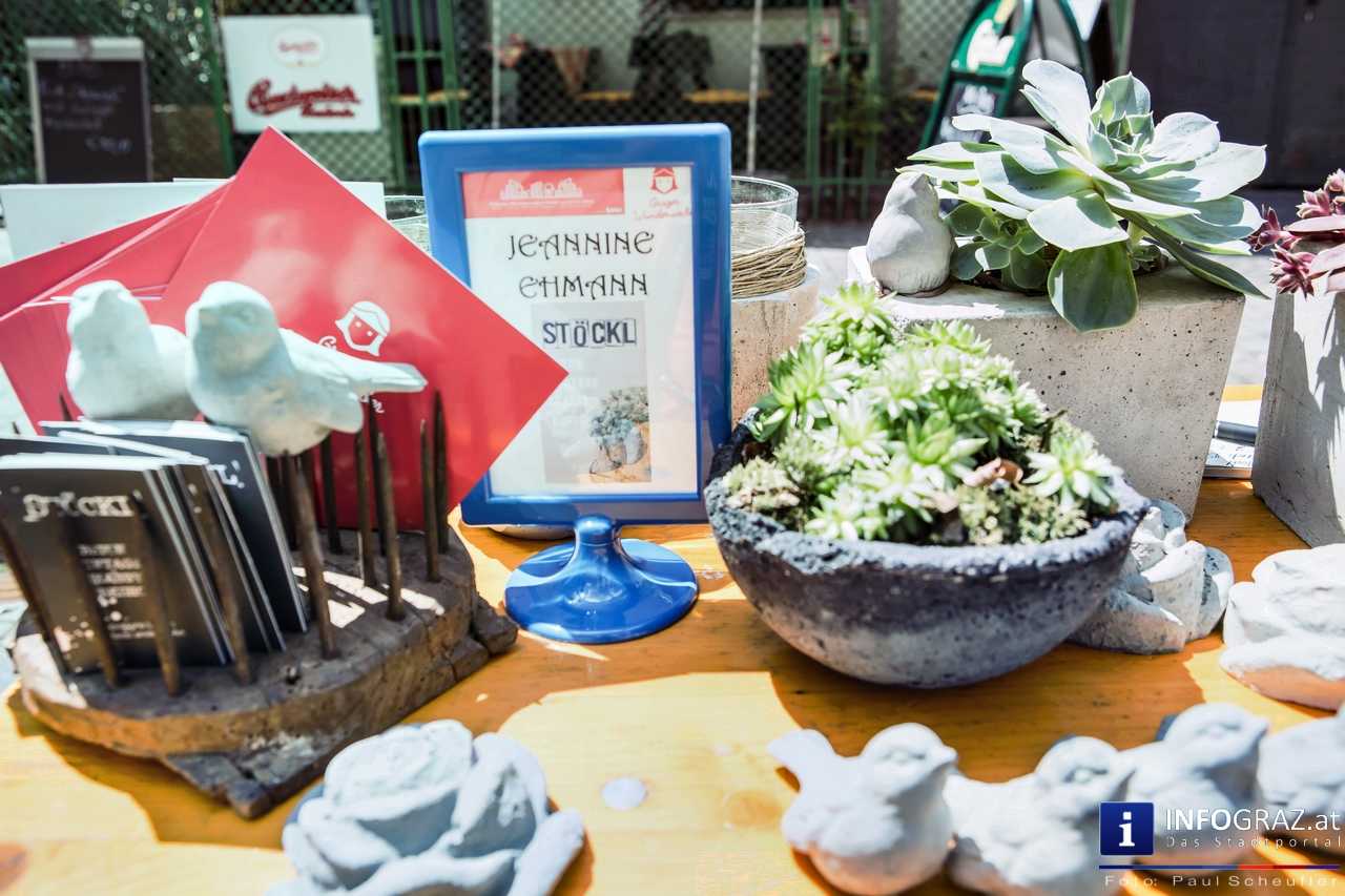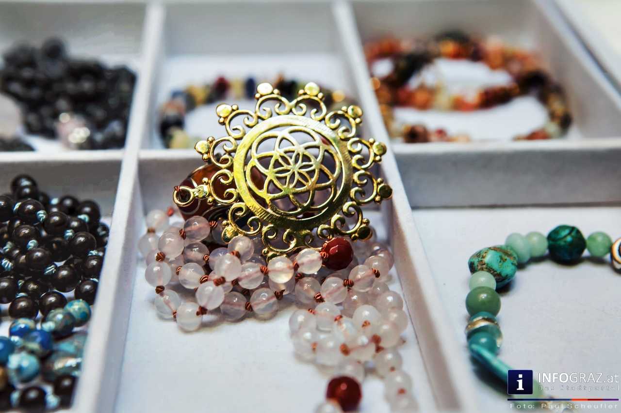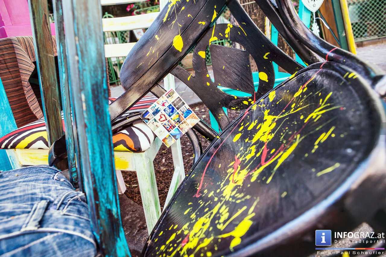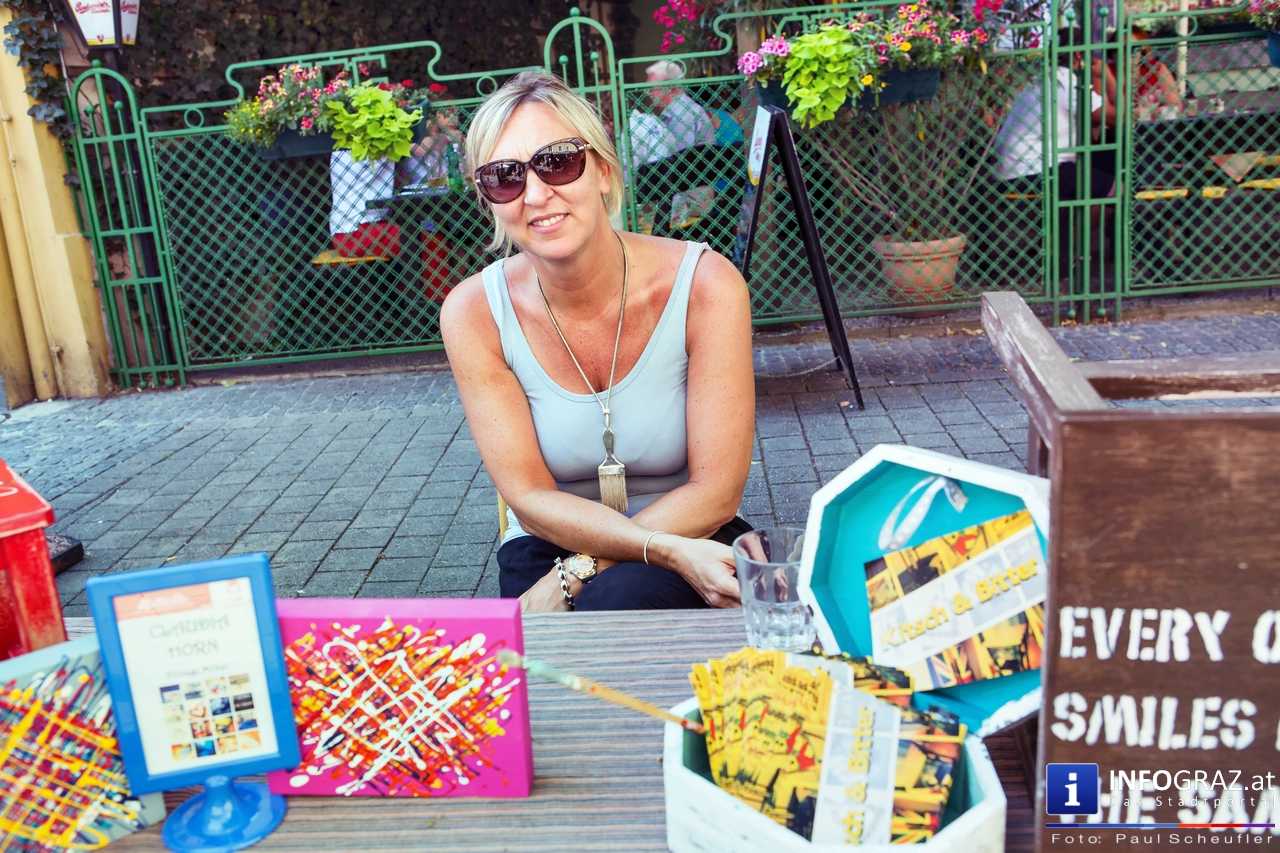 Bilder mit esoterischer Botschaft, Tücher, Schals, Handtaschen, Schmuck, Kinderspielzeug – ein großes Angebot in der Griesgasse und im schattigen Innenhof von PARKS-Art, wo FRAU sich von der Hitze draußen erholen konnte.