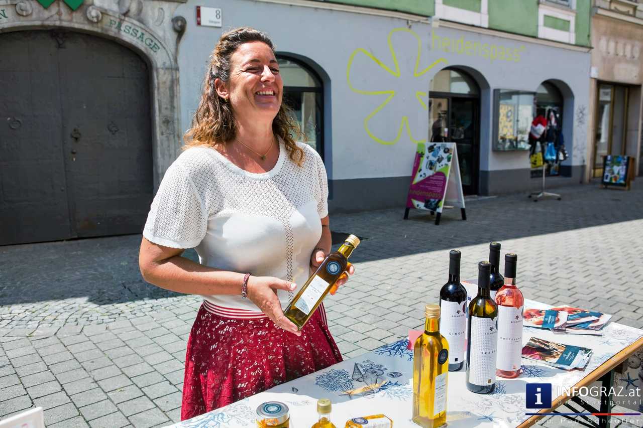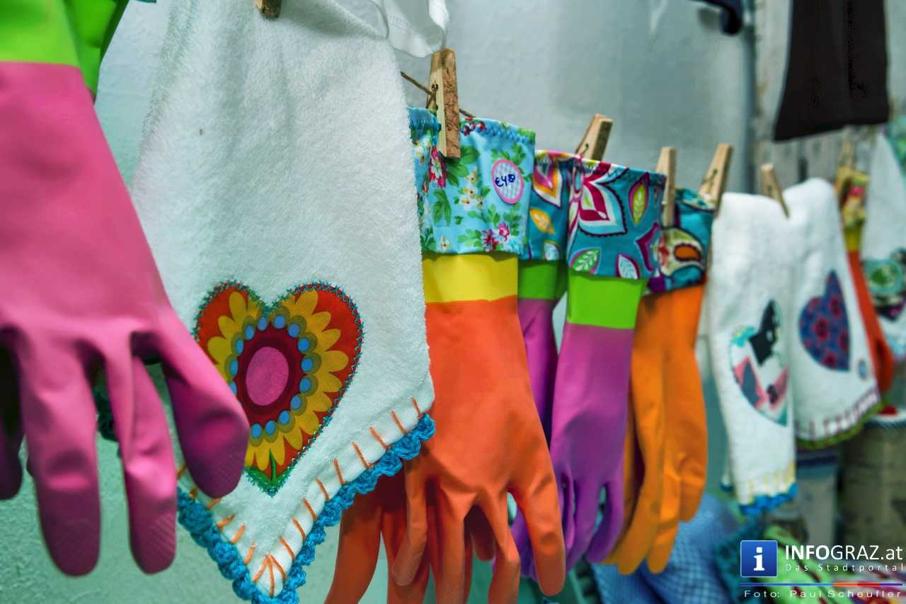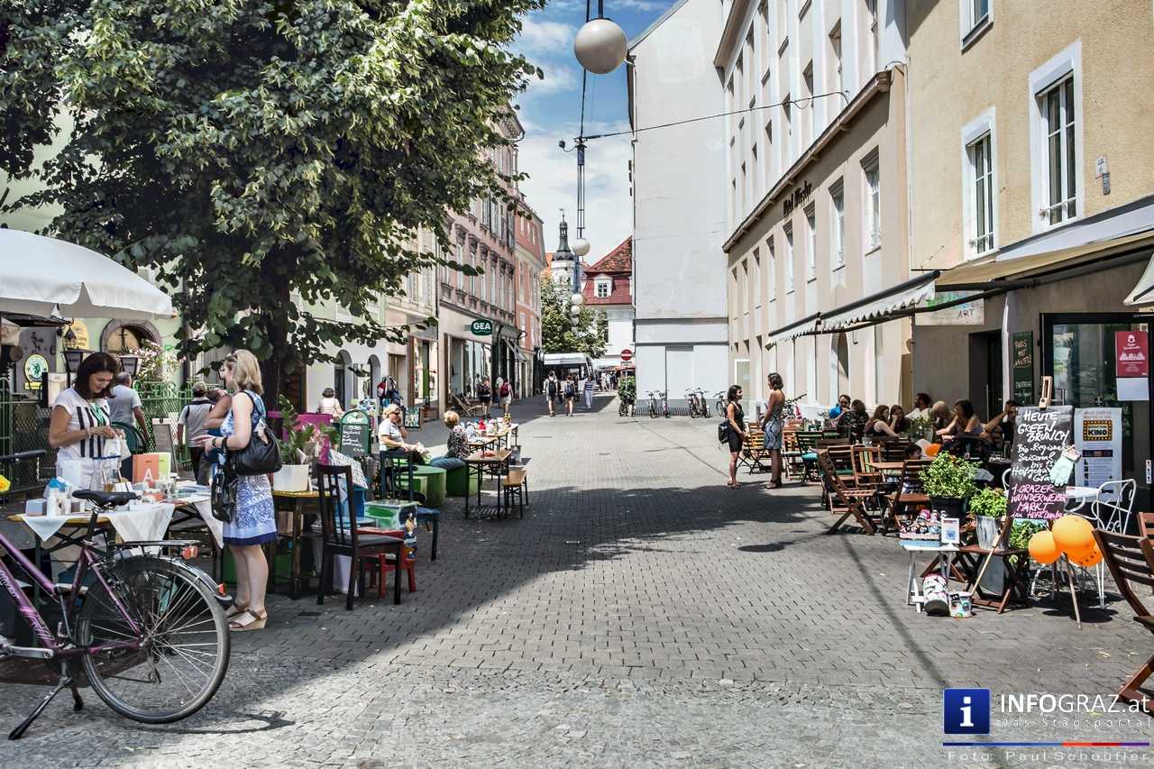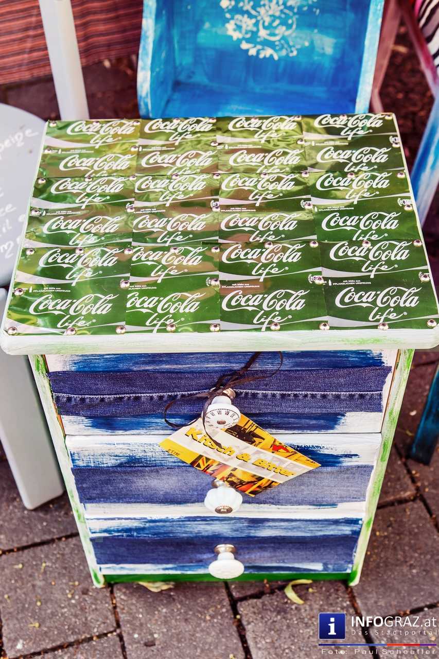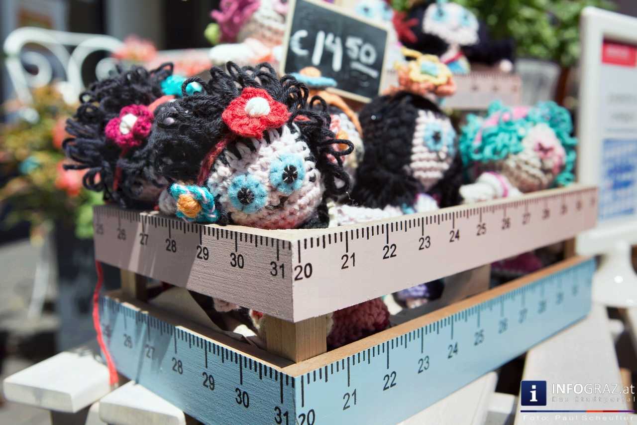 Bilder mit esoterischer Botschaft, Tücher, Schals, Handtaschen, Schmuck, Kinderspielzeug – ein großes Angebot in der Griesgasse und im schattigen Innenhof von PARKS-Art, wo FRAU sich von der Hitze draußen erholen konnte.