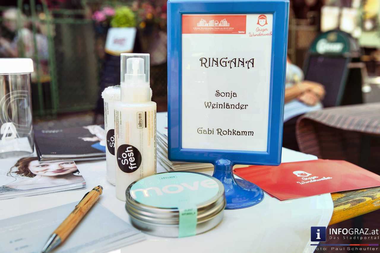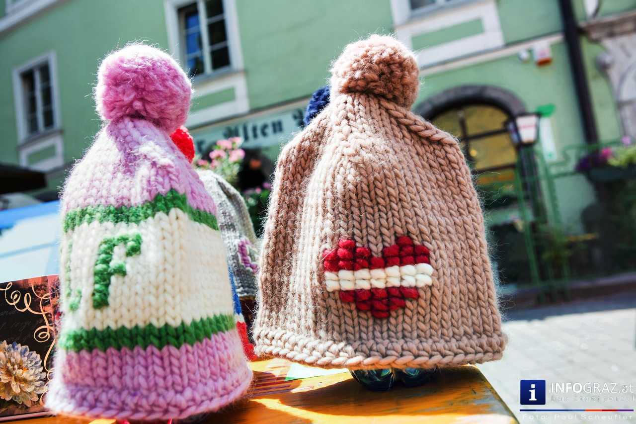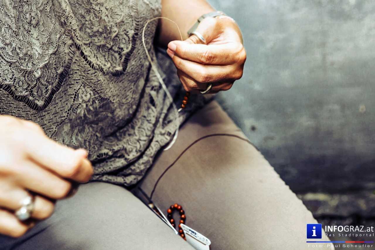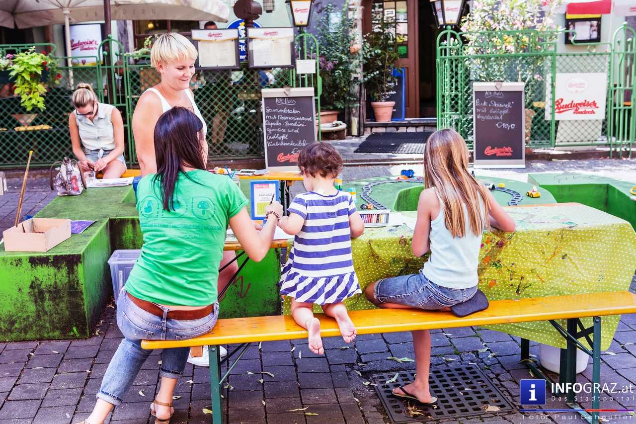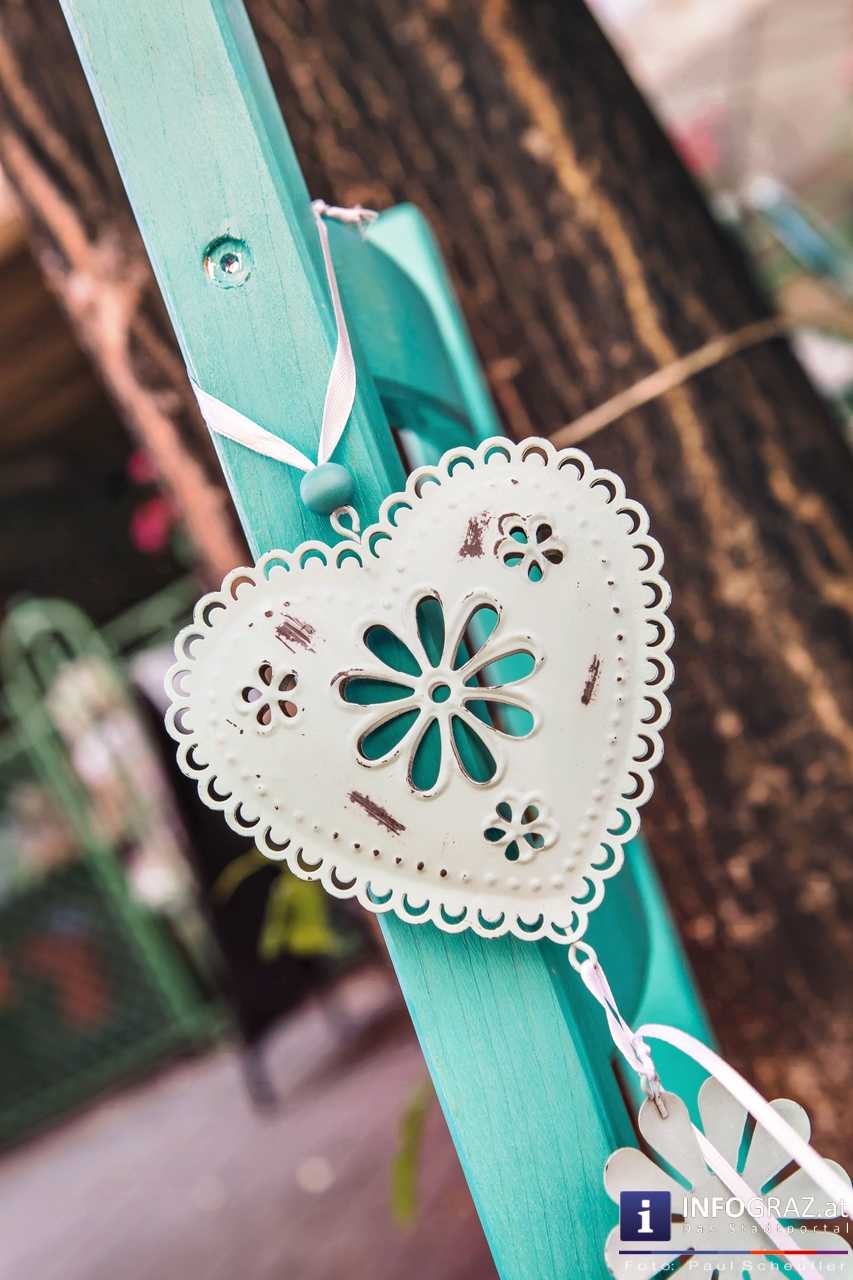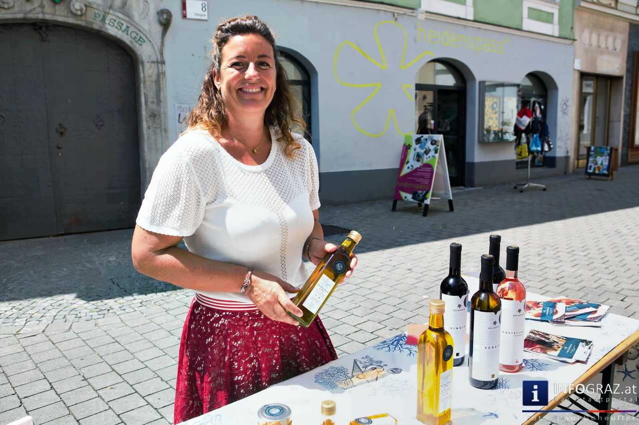 Bilder mit esoterischer Botschaft, Tücher, Schals, Handtaschen, Schmuck, Kinderspielzeug – ein großes Angebot in der Griesgasse und im schattigen Innenhof von PARKS-Art, wo FRAU sich von der Hitze draußen erholen konnte.