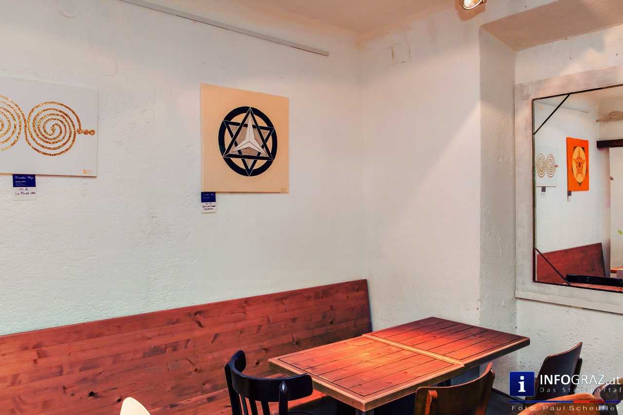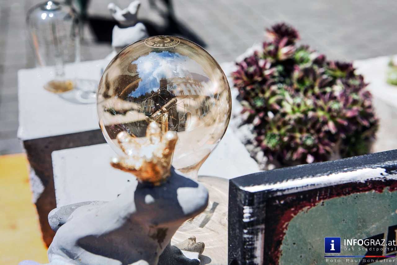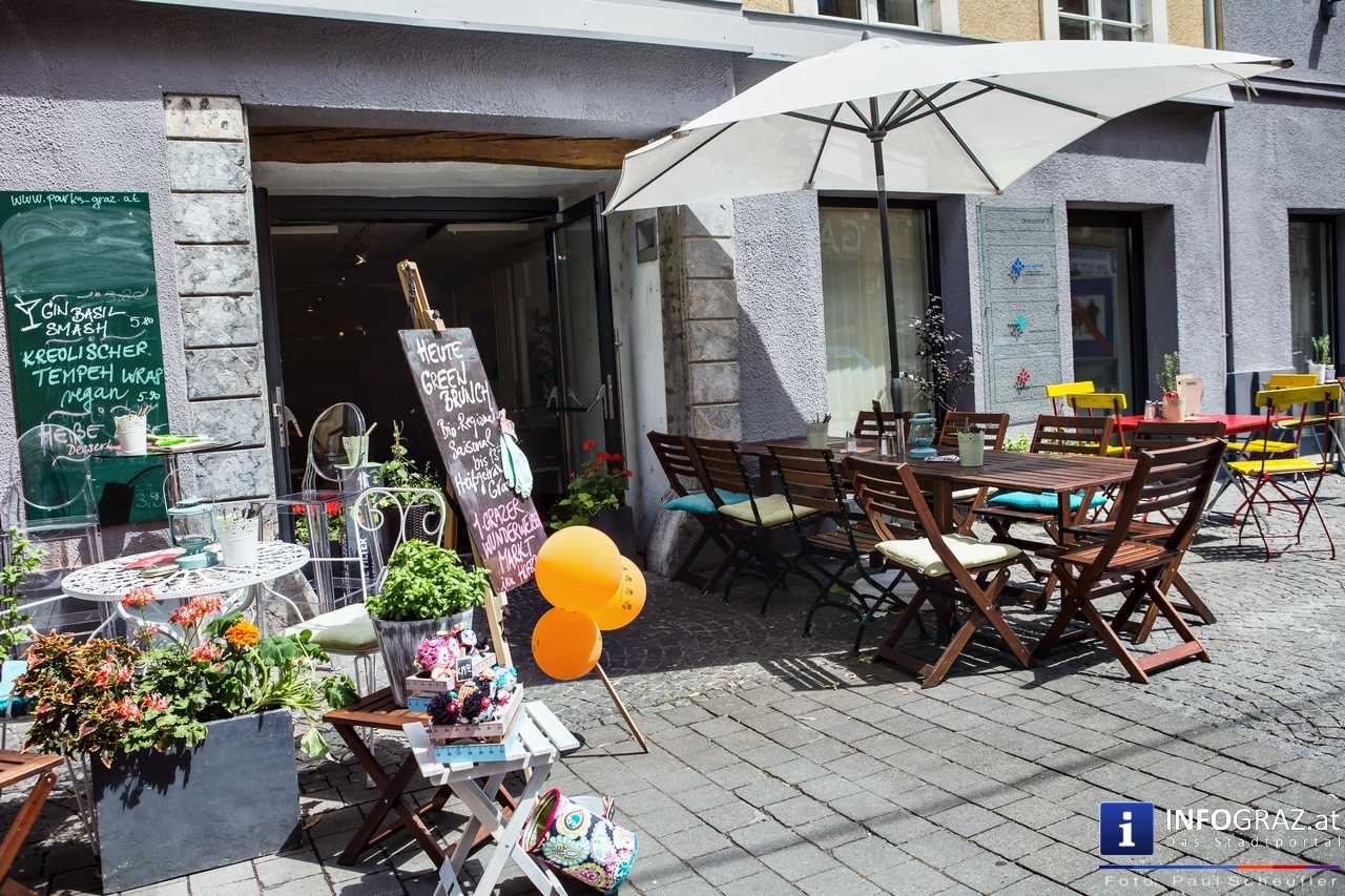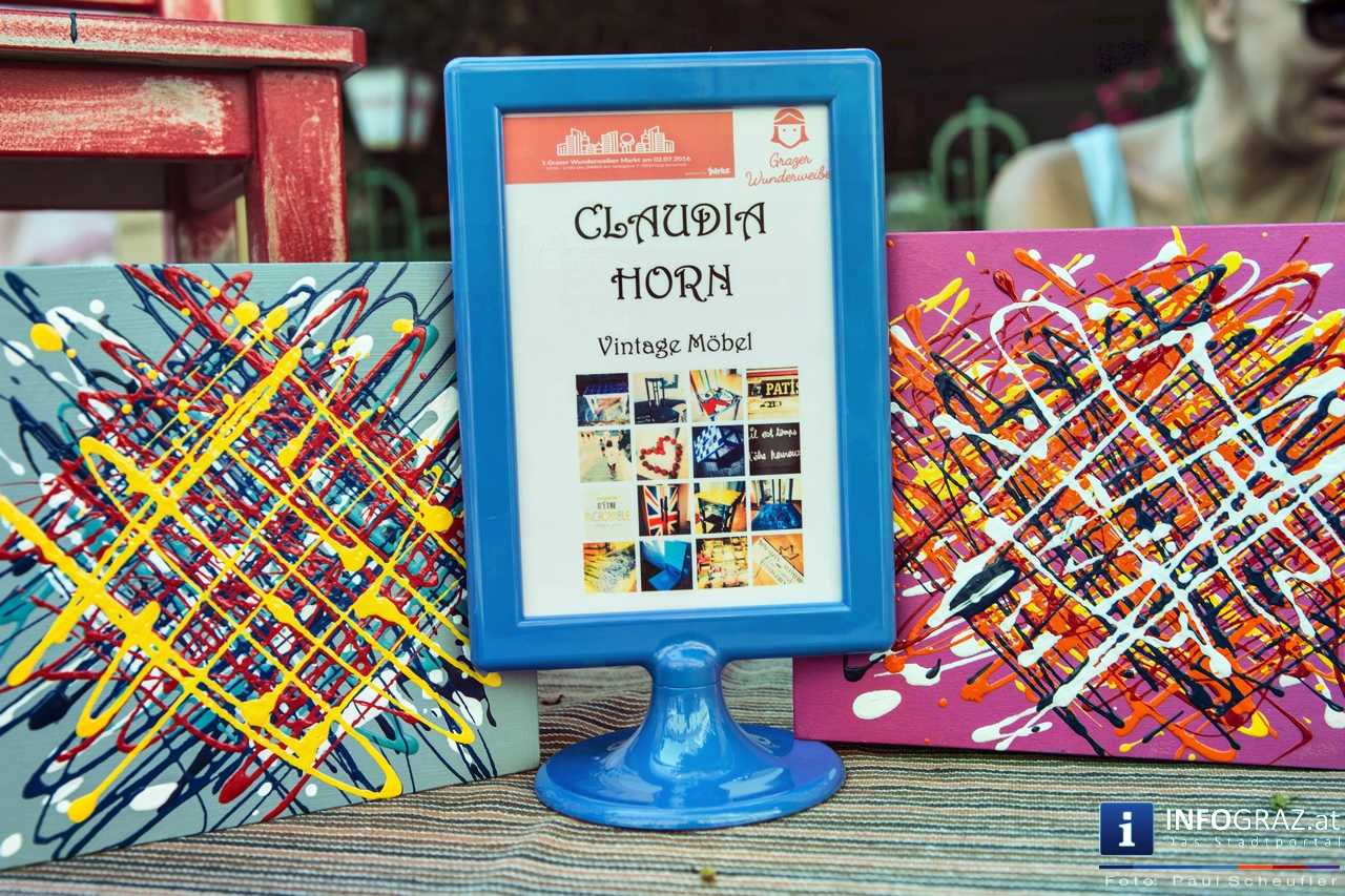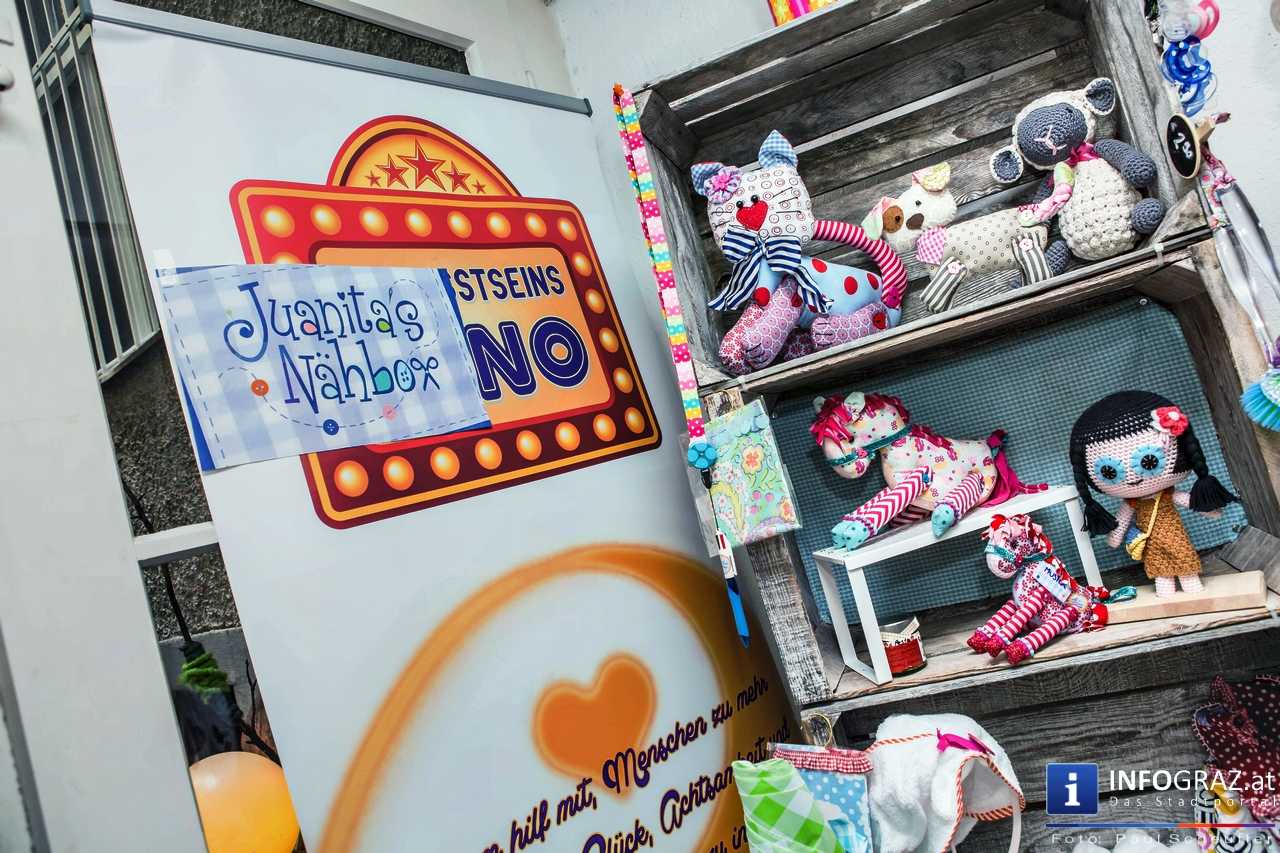 Bilder mit esoterischer Botschaft, Tücher, Schals, Handtaschen, Schmuck, Kinderspielzeug – ein großes Angebot in der Griesgasse und im schattigen Innenhof von PARKS-Art, wo FRAU sich von der Hitze draußen erholen konnte.