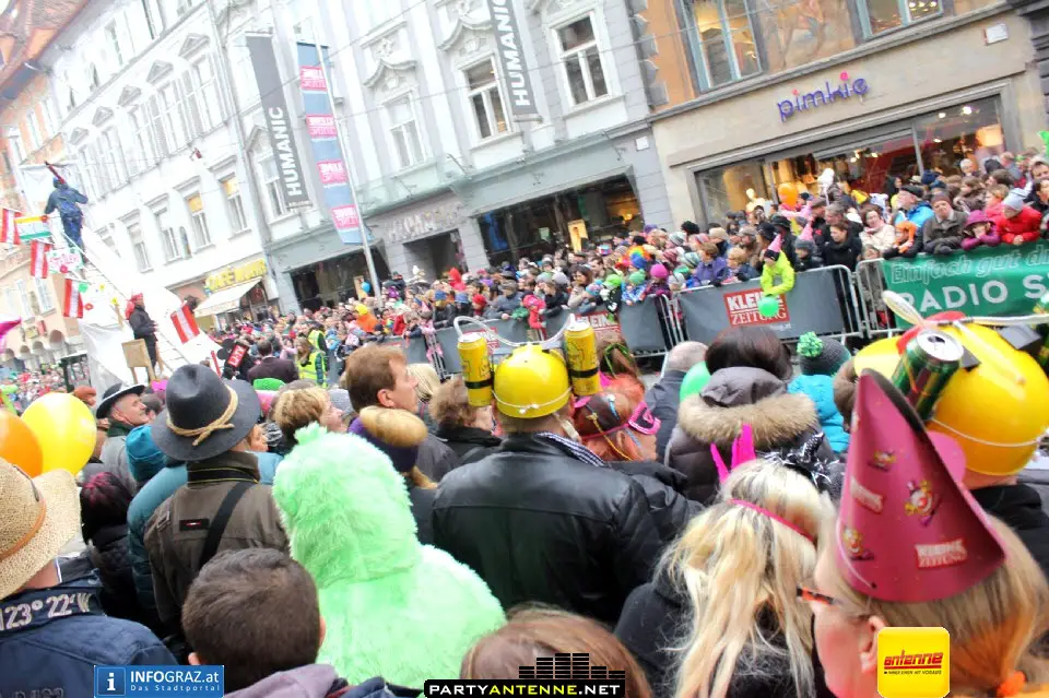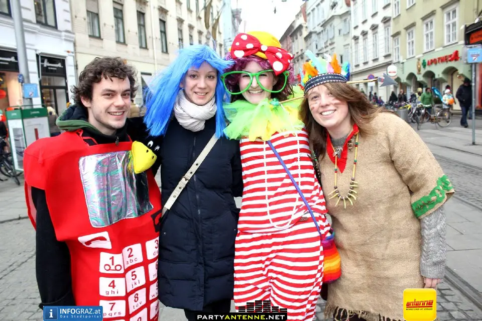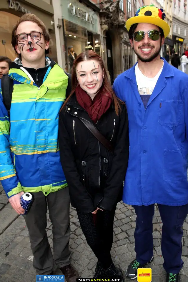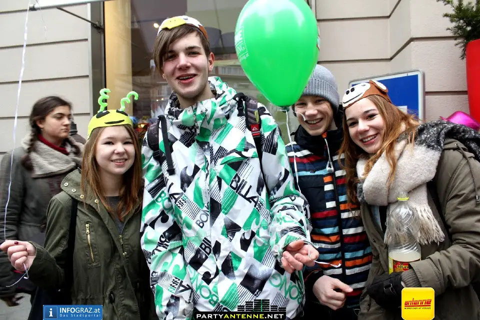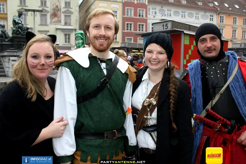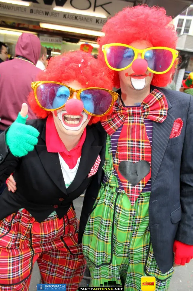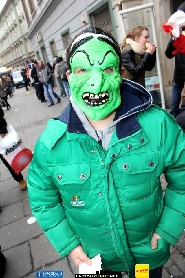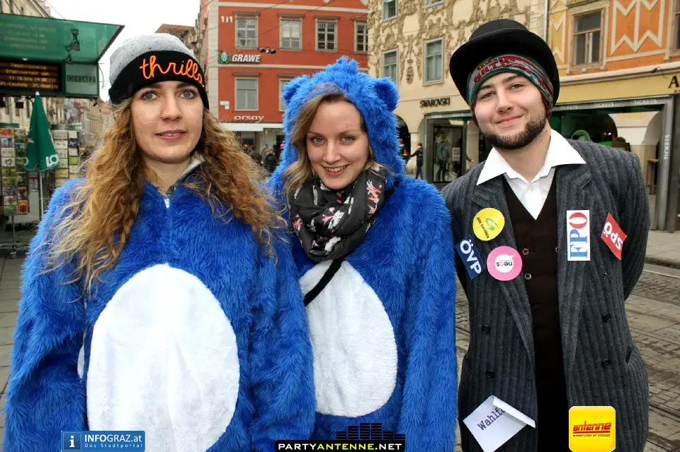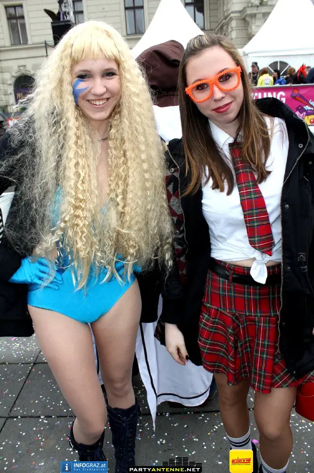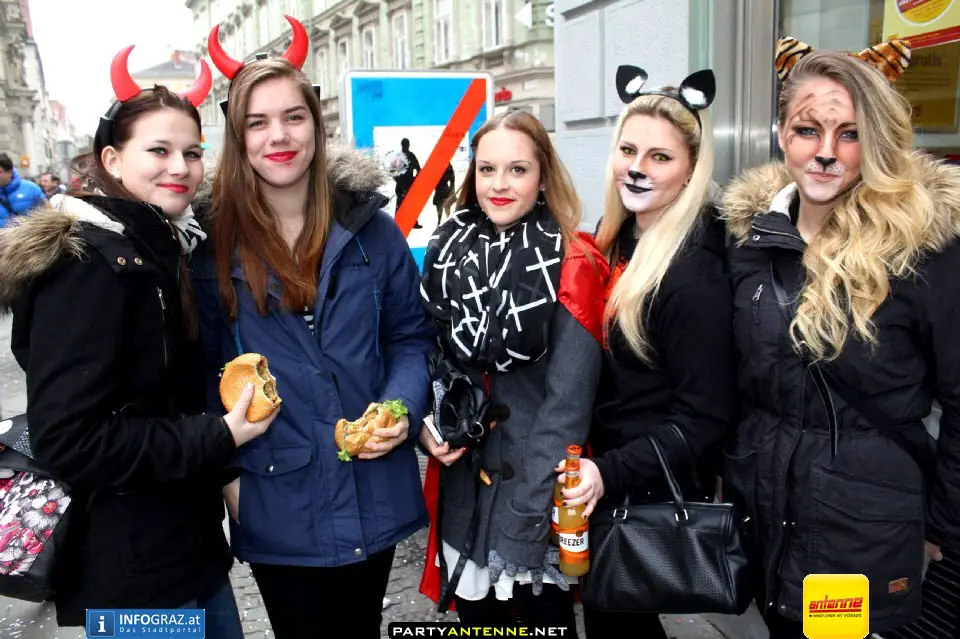 Beim diesjährigen Faschingsumzug wurde in Graz wieder allerhand Skurriles, Erstaunliches und Unterhaltsames geboten. Seltsamste Gestalten - riesige Conchita-Würste, sexy Cowgirls, Polizisten, Piraten, Geistliche, Superhelden und vieles mehr - zelebrierten den verrücktesten Tag des Jahres. © Partyantenne
