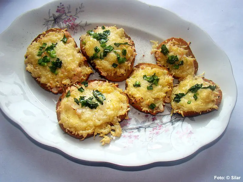 Kleine Häppchen mit Käse, Tomaten, Oliven, Mayonnaise, grüne Zwiebeln, etc.
