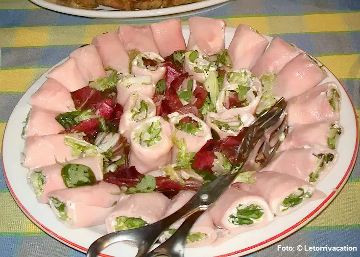 Schinkenröllchen aus Kochschinken, gefüllt mit grünen Bohnen und Remoulade