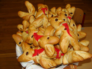 ![]() | Die beiden kleineren Teile werden für den Krampuskopf etwas flach gedrückt und auf den gedrehten Körper gesetzt. 2 Rosinen für die Augen platzieren. Mit einer Schere den Zottelpelz einschneiden, nochmals gehen lassen. Krampusse mit Ei bestreichen, Krampuszungen andrücken und im vorgeheizten Rohr bei 200 Grad zirka 20 Minuten backen. |