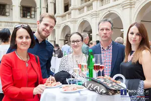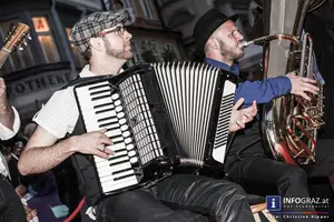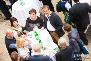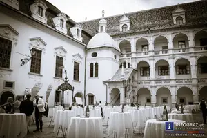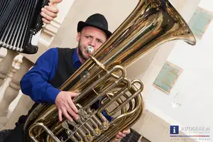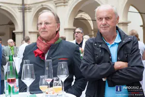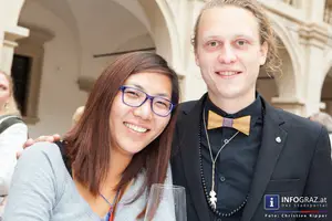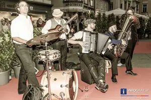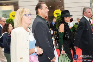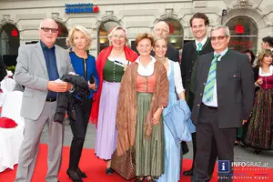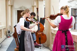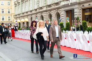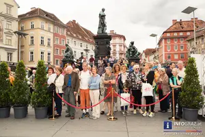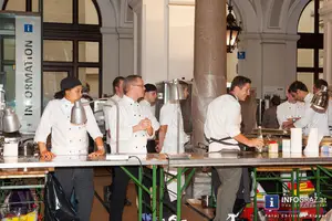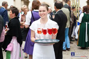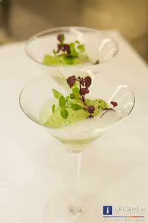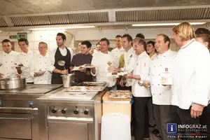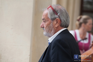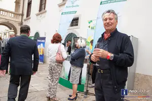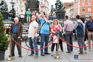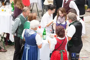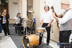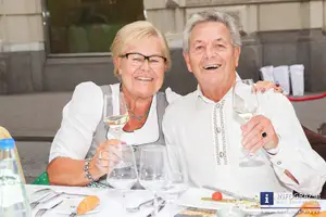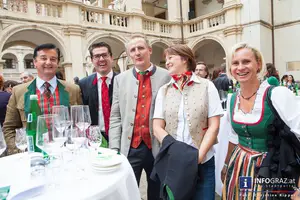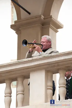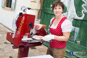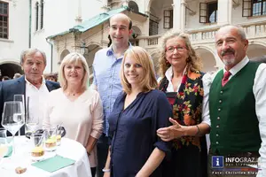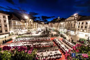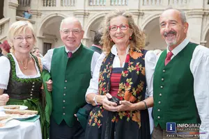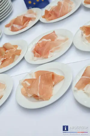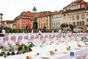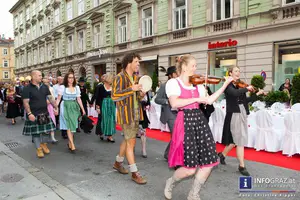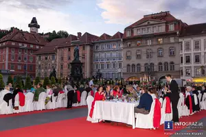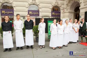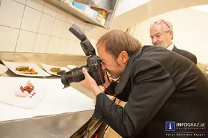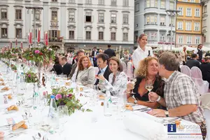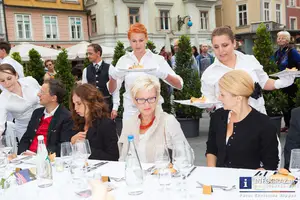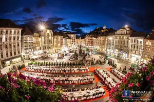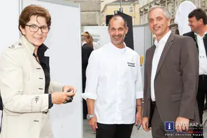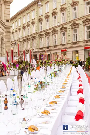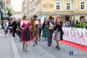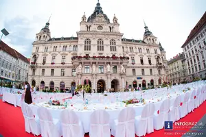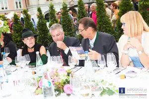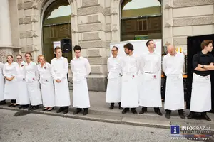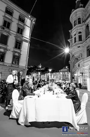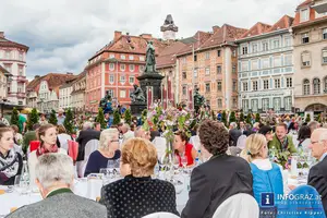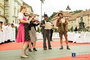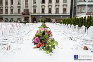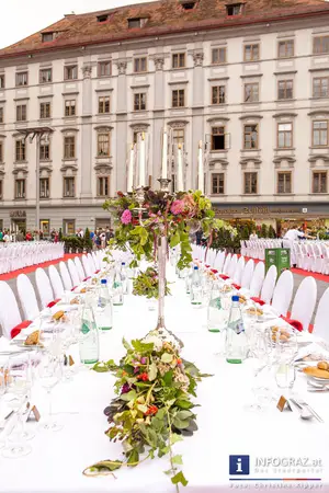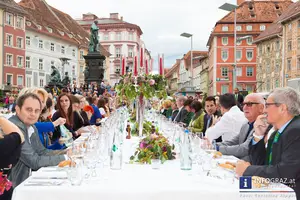 Hauptplatz Graz am 16. August 2014 Die lange Tafel der Genuss-Hauptstadt Graz 2014 Vor einigen Jahren wurde Graz der Titel “Genusshauptstadt” verliehen, mit dem Ziel vorzugsweise Produkte aus GenussRegionen von steirischen Produzenten in den Küchen der gastronomischen Partnerbetriebe zu verwenden. Das ist auch das Motto der Langen Tafel am Grazer Hauptplatz. Empfangen wurden die Gäste im Landhaushof mit einem Aperitif und das Erzherzog-Johann-Lied mit Jodler bildete den offiziellen Auftakt – interpretiert von Startrompeter Professor Toni Maier. Beim Empfang wurde Bier und Wein verkostet sowie der Vulcano-Schinken. Mit musikalischer Begleitung der “Spafudler” wurden die Gäste zum Hauptplatz geführt, um an der Tafel mit blütenweißem Damast und silbernen Kerzenleuchtern Platz zu nehmen. Die “Clock Tower Dixie Band” verwöhnte mit Jazz. Beim Degustationsmenü wurde unter anderem ein Steirisches Hochbeet, Lachsforelle, Geeistes Strauchbasilikum & Oststeirischer Apfel sowie weitere Köstlichkeiten gereicht. Die besten Winzer des Landes stellten die passende Weinbegleitung zur Verfügung. Copyright-Regeln & Tipps für den optimalen Download bei INFOGRAZ.at erklären wir Ihnen hier! Größere Formate der Bilder von der langen Tafel der Genuss-Hauptstadt Graz 2014 (auch zum Download) demnächst hier. Wenn Sie alle Bilder über DropBox oder FTP wollen - Mail (und vorher die Copyright-Regeln gründlich lesen). Wenn die größeren Bilder länger nicht hier als Link zu finden sind: nachstoßen. |