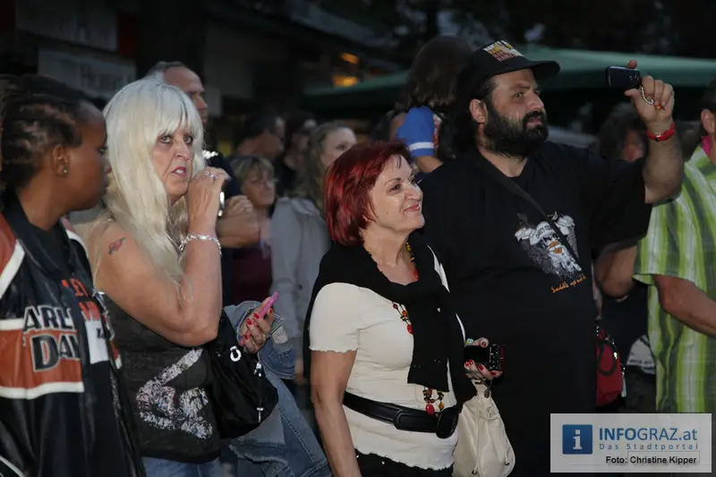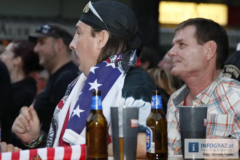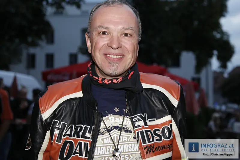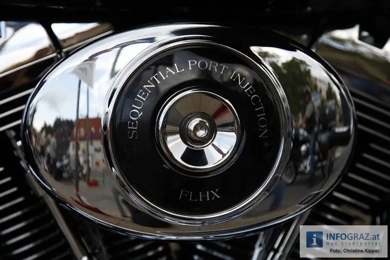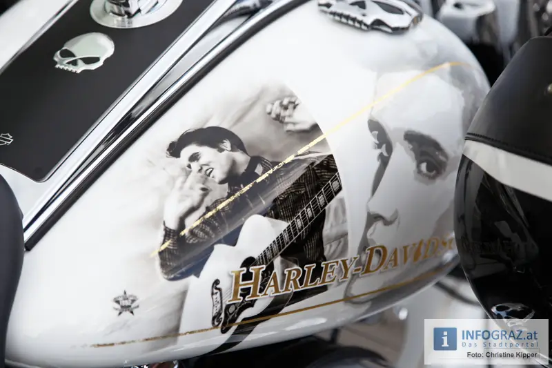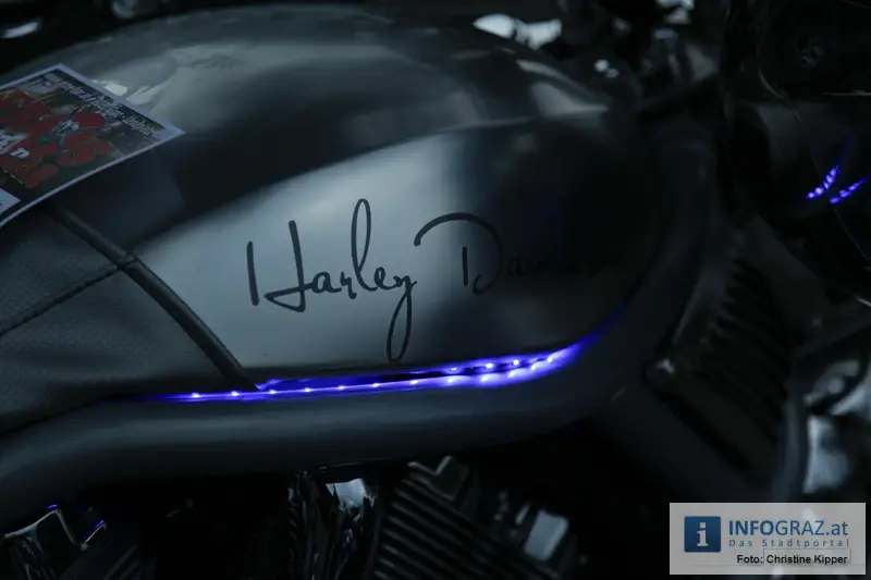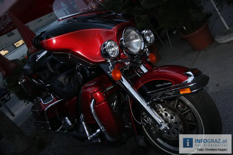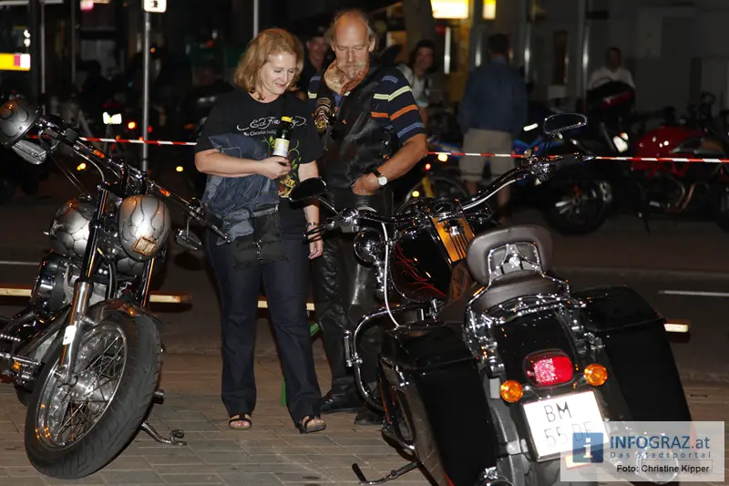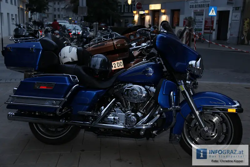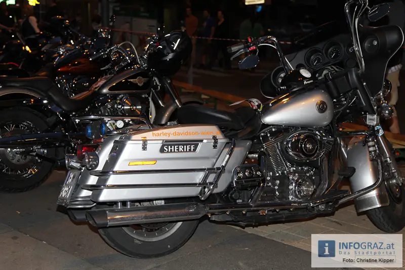 Rund 200 Maschinen der US-Kultmarke machten gestern Abend am Grazer Lendplatz Station. Bei dieser Abendveranstaltung sorgte die Band “Austrian Tribute to Dire Straits” für die Musik. Bei dieser Charity-Tour sammeln die Biker Spendengelder für muskelkranke Kinder.