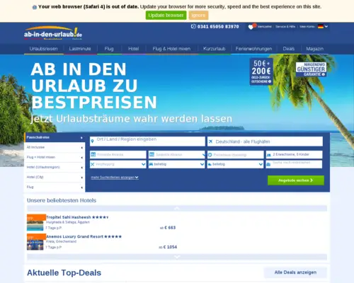 Das leicht zu bedienende Internet-Reisebüro bietet Ihnen eine Plattform, die Sie und Ihre Lieben in nur wenigen Klicks zu Ihrer Lieblingsdestination bringt. Ins Reisebüro gehen, langes Suchen in Katalogen und überteuerte Preise waren gestern – „ab-in-den-urlaub“ macht es Ihnen möglich, bequem und einfach von zu Hause aus Ihren Traumurlaub zu buchen.