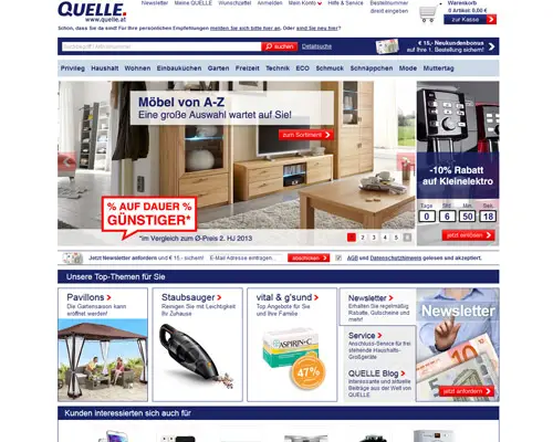 Sofort auf der Startseite von quelle.at sehen Sie aktuelle Spar-Preise und Sonderangebote. Weiter unten präsentieren sich der Bereich „Top-Themen für Sie“ sowie weitere „Top-Angebote“. Jede Menge reduzierte Artikel und Prozente finden Sie natürlich auch in der Rubrik „Schnäppchen“. Wenn Sie den Newsletter abonnieren, bekommen Sie nicht nur alle Infos über Trends und Top-Schnäppchen sowie exklusive Quelle.at Gutschein- und Rabattaktionen, sondern auch einen Quelle Willkommensgutschein. Auch als Neukunde erhalten Sie einen Quelle Gutschein für Ihre erste Bestellung. Einen Überblick über alle Sonderaktionen geben Ihnen auch die Seiten bei Facebook, Twitter und Google Plus.