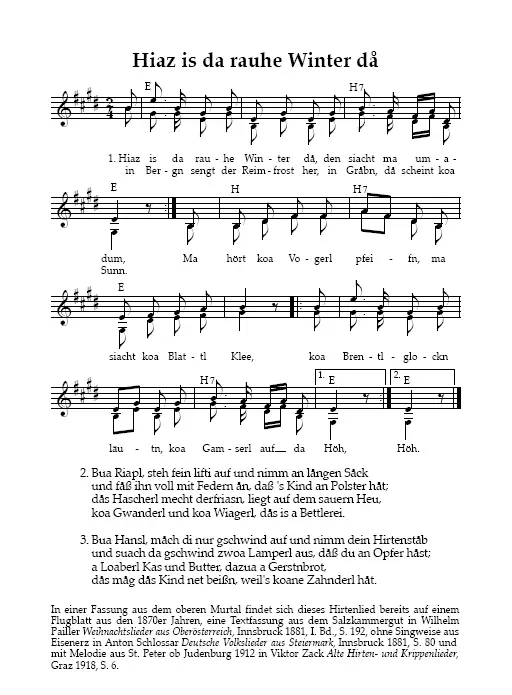 | | Hiaz is der rauhe Winter då, den sicht ma um und um, in Bergn sengt der Reimfrost her, in Gråbn, då scheint ka Sunn. Ma hört ka Vogerl pfeifn, ma siacht ka Blattl Klee, ka Brentlglocken läutn, ka Gamserl auf der Höh. Mei, wås soll dås bedeutn, dåß s' heut um Mitternåcht mit der Sturmglockn läutn, håt a Engl a Botschåft bråcht. Messias soll geboren sein, kommt aus dem Paradeis, sei Muatter soll a Jungfrau sein, dös war amål wås Neus. Viel Glück, meine Hirtn, seids munter und wåcht, ihr derfts enk net fürchtn, wånn 's glei is Mitternåcht. Ihr håbts jå vernommen die englische Stimm, stehts auf und gehts eilends nåch Bethlehem hin. Bua Riapl, steh fein lifti auf und nimm an lången Såck und fåß ihn voll von Federn ån, daß 's Kind an Polster håt; dås Hascherl möcht derfriasn, liegt auf dem sauern Heu, ka Gwanderl und ka Wiagerl, dås is a Bettlerei. Bua Hansl, måch di nur gschwind auf und nimm dein Hirtenståb und suach dir gschwind zwoa Lamperl aus, dåß du an Opfer håst; a Loaberl Kas und Butter, dazua a Gerstnbrot, dås måg dås Kind net beißn, weil 's koane Zahnderl håt. Und wånn i amål sollt reicher werdn, åft werd i wieder kemm, åft werd i dir a Ganserl bring, is besser wiar a Henn. O Jesu, liebster Jesu mein, veråcht nicht meine Gåb! I hätt dir gern wås Bessers bråcht, du woaßt, dåß i nix håb. |