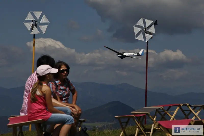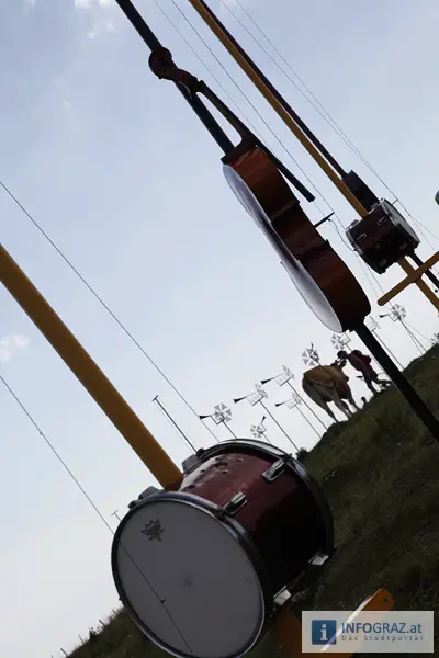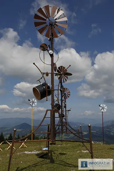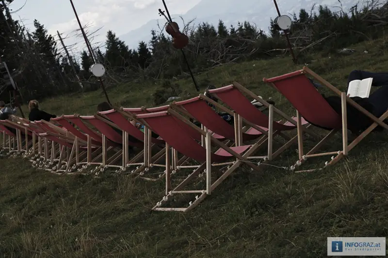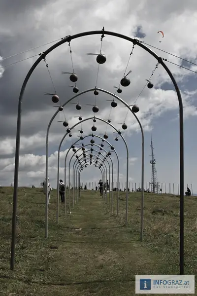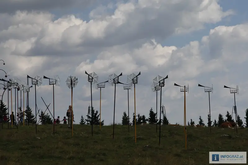 Andere dirigieren ein Orchester. Pierre Sauvageot dirigiert den Wind. Der Musiker & Komponist, der in Graz etwa schon die legendäre „Babel.Platz.Symphonie“ mit mehr als 100 Musikern auf dem Freiheitsplatz in Szene setzte, hat sich diesmal das liebste Ausflugsziel der Grazer ausgesucht und errichtet auf dem Schöckl-Gipfel seine „Harmonic Fields“.