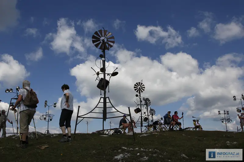 Die eifrigen Schöckl-Wanderer bestaunen die ungewohnten Installationen
