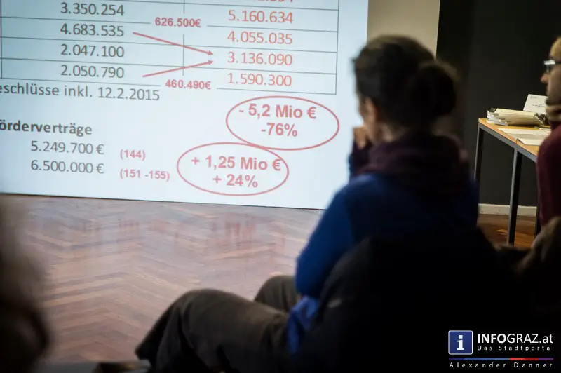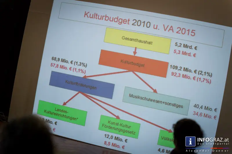 Die Zahlen sprechen eine deutliche Sprache: Obwohl das Gesamtbudget des Landes Steiermark stetig steigen würde, sinke das Kulturbudget im selben Untersuchungszeitraum deutlich. Und das obwohl die Ausgaben und Förderungen für Kultur in Relation zum Gesamtbudget im Vergleich zu anderen Bundesländern ohnehin lange schon am geringsten wären.