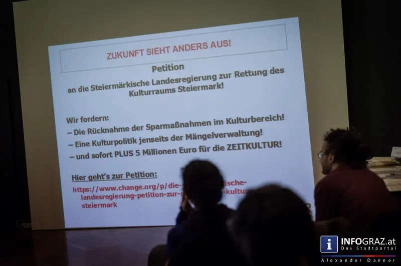 ig kultur steiermark,kulturzentrum bei den minoriten,komplett gestrichen,steirischer kulturbetrieb,überlebenskampf,kunstschaffende,kulturschaffende,entsolidarisieren,publikumsgespräch,sofortmaßnahme,selbstorganisation,petitionDes Weiteren wurde der Ruf nach verstärkter Selbstorganisation laut. Eine entsprechende Petition der IG Kultur mit dem Titel "Zukunft sieht anders aus - Rettung Kulturraum Steiermark" ist bereits im Umlauf.