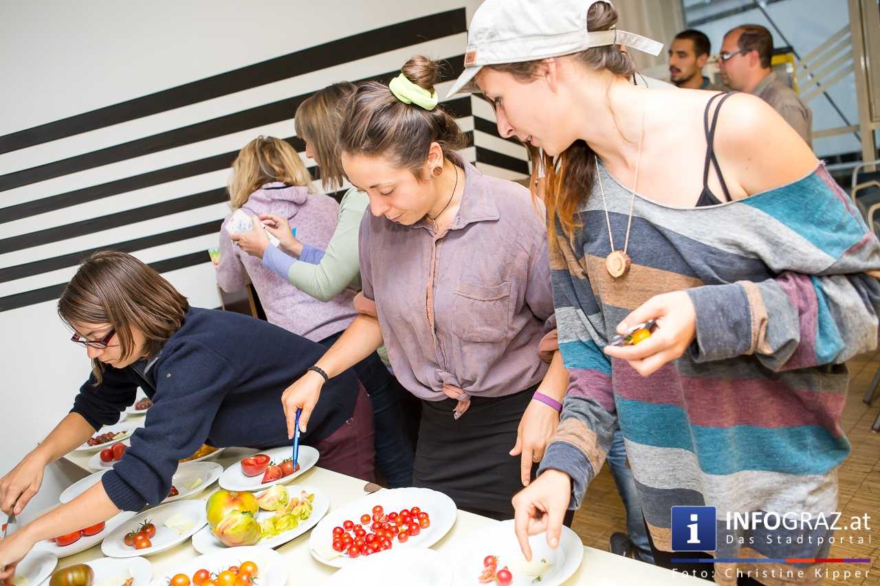 Als Beitrag zur Erhaltung und Weiterentwicklung der Kulturpflanzenvielfalt fand das Fest der Tomatenvielfalt im Forum Stadtpark statt. Faszinierend ist die Auswahl sortenrein vermehrbarer Paradeiser in allen Größen, Farben und Formen. Auch Früchte aus dem eigenen Anbau konnten mitgebracht werden. Von der kleinen Johannisbeertomate bis zur großen Fleischtomate, gestreifte Paradeiser, sowie in allen Farbschattierungen von gelb bis dunkelrot wurden gezeigt.