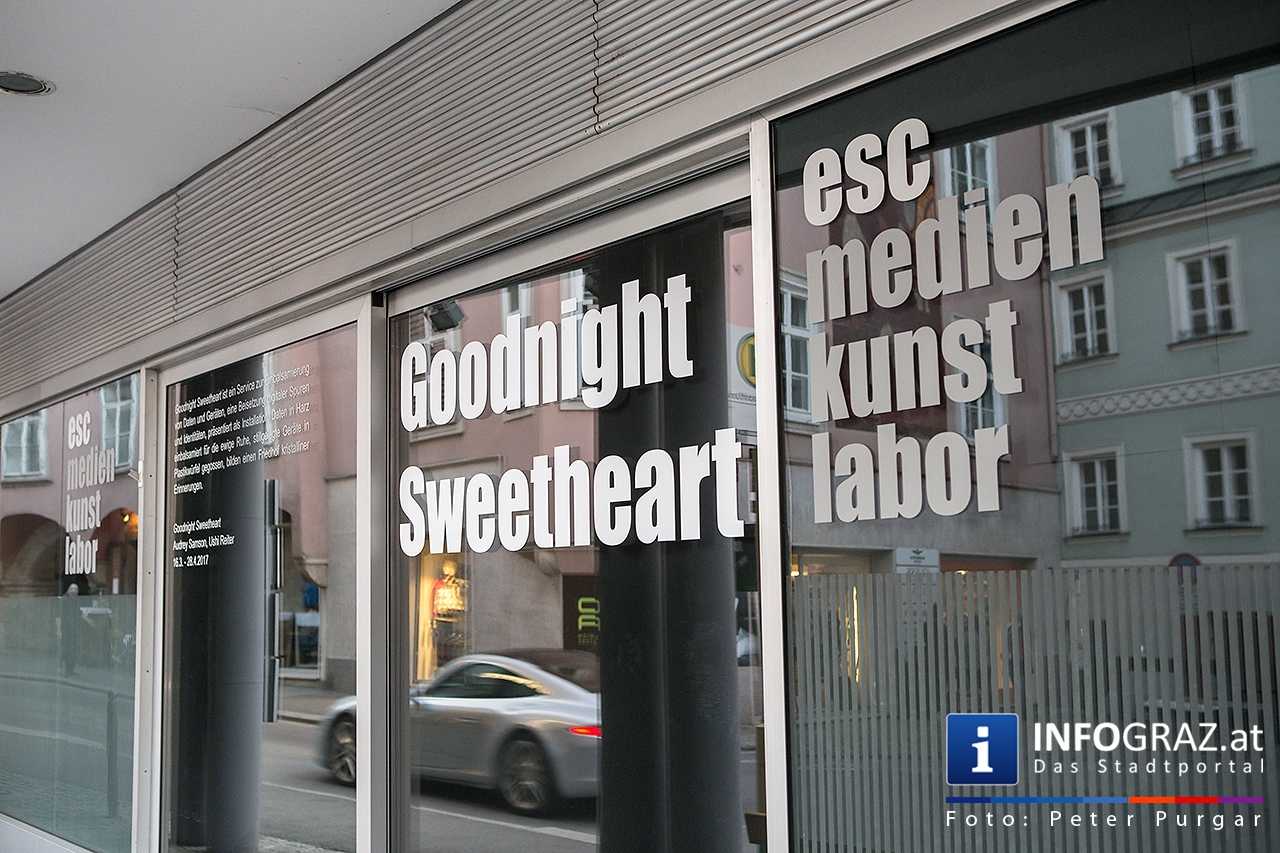 Wie uns ESC-Mitbetreiberin Reni Hofmüller auf Nachfrage erklärt, handelt es sich bei "Goodnight Sweetherart" um das erste Eigenprojekt der ESC im Rahmen ihres Jahresschwerpunkt "Nichts als Konzentration". Wir merken natürlich sofort, das kann man auf zwei Weisen lesen: "Nur Konzentration" oder "Konzentration als bloßes Nichts" bzw. als buddhistisches (?) Zerfließen, und fragen deshalb weiter: Warum ist grade das der Jahresschwerpunkt, und was haben nochmal Festplatten in Kunstharz damit zu tun?