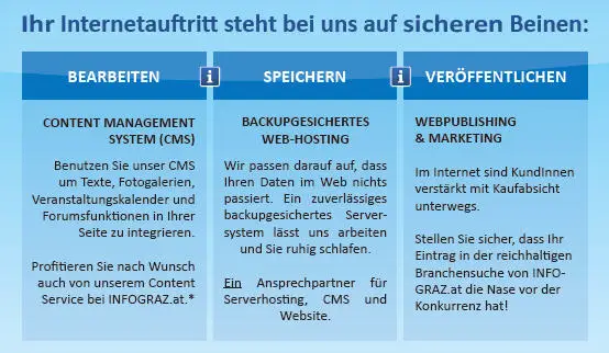 Mit einem Premiumeintrag oder Premium PLUS-Eintrag auf INFOGRAZ.at wird Ihr Unternehmen bei einem Klick dort auch auf den vorderen Plätzen stehen.